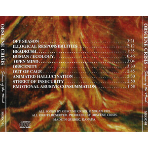 Montreal just seems to consistently ooze quality metal, and Obscene Crisis are further proof of this. Given more time in the studio and a bigger budget, they could very easily, in my opinion, become major contenders in metal realms. Already garnering acclaim in Europe, according to the band, this is one group to keep an eye and ear out for. Do yourself a favour and seek out a copy of this mini-album.