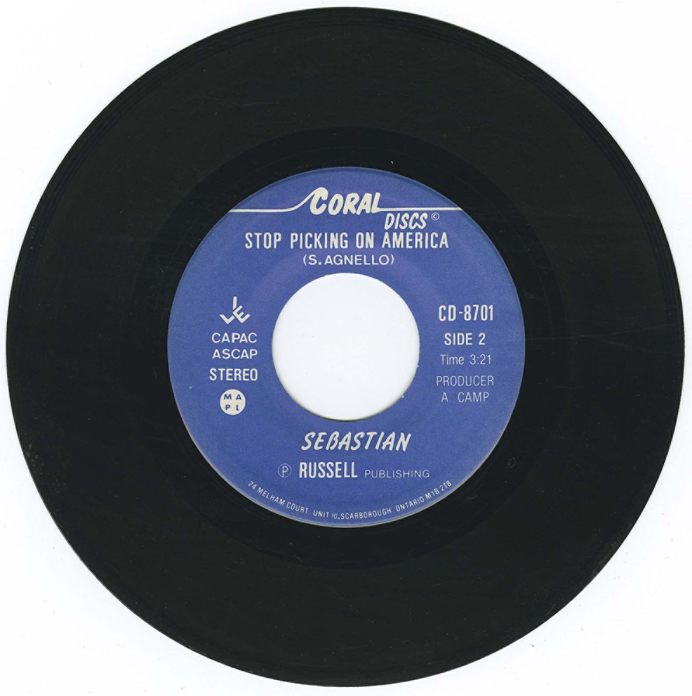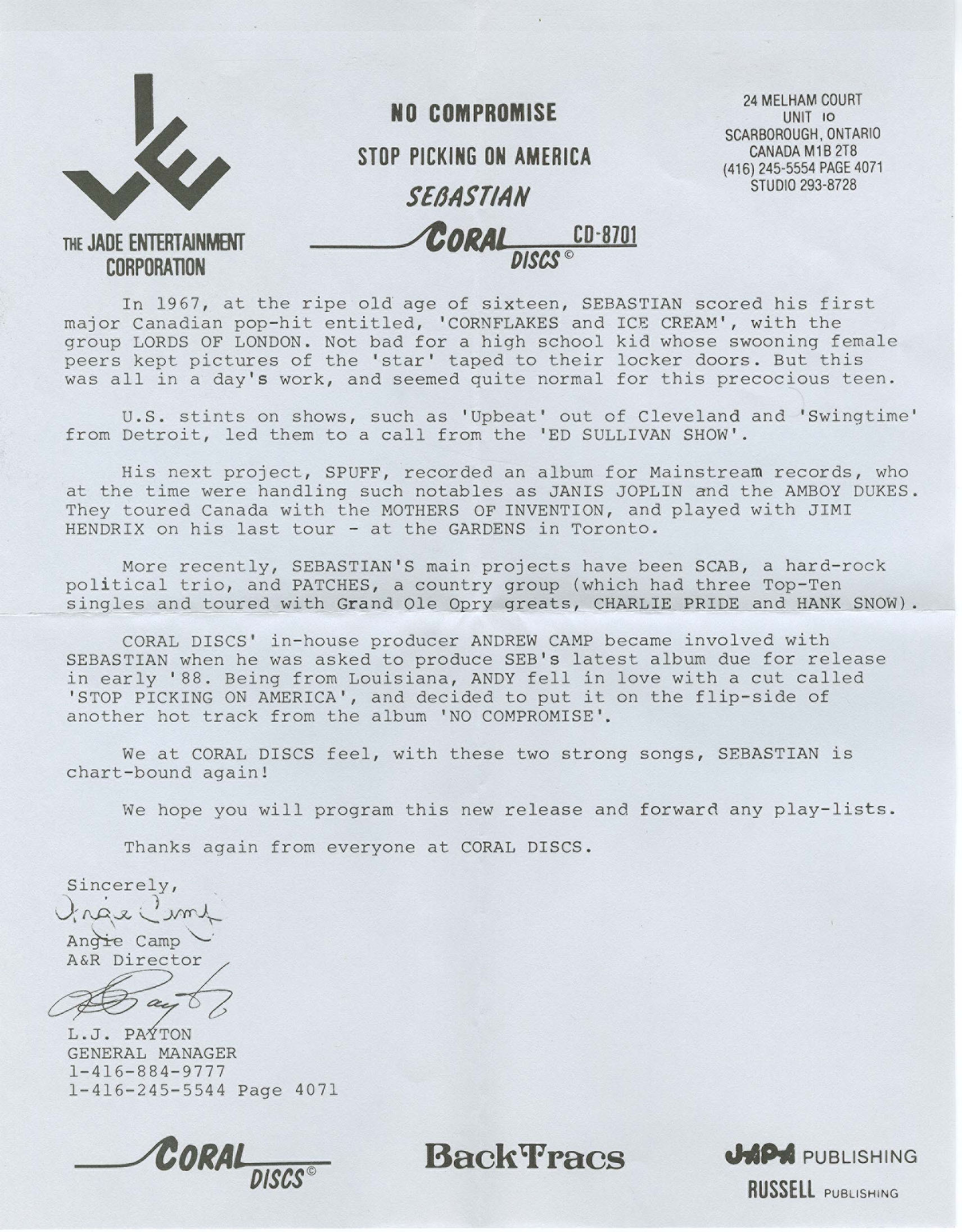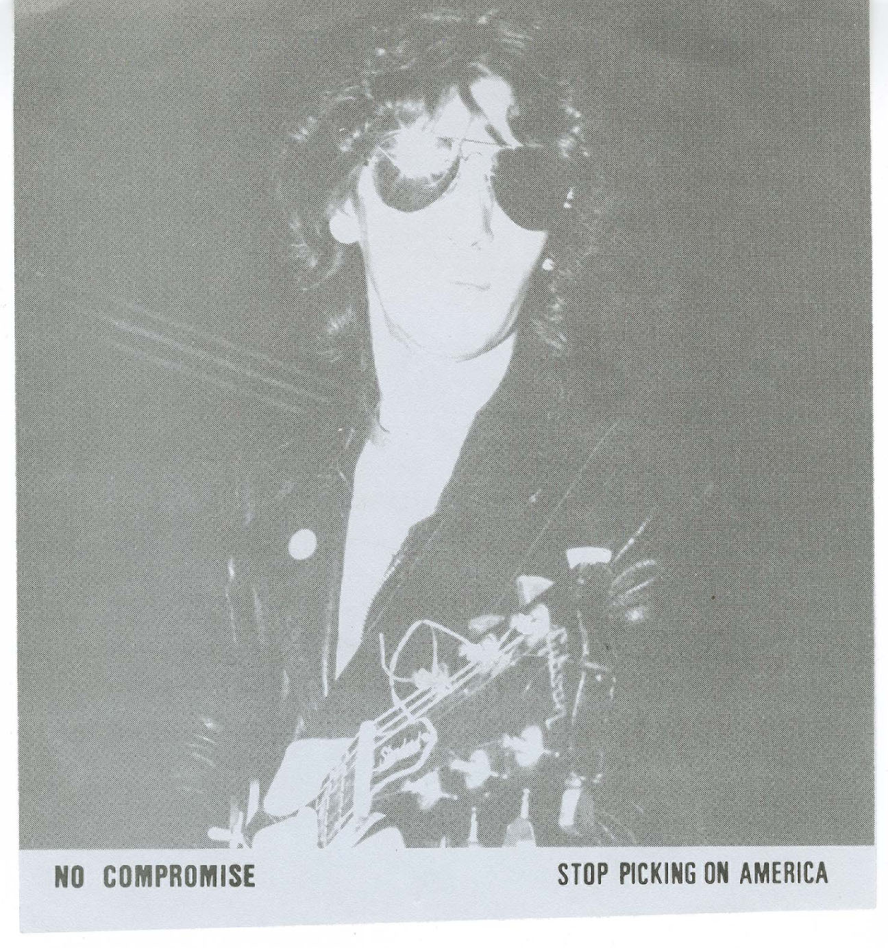 On a serious note, the man is a guitarist to be reckoned with. Displaying a fluid style that is deftly complemented by the backing drums and bass, Sebastian weaves a musical trail through the weirdness of North America in the 1980’s. Is he part of that eccentricity himself? You be the judge- the B side of “No Compromise” is called “Stop Picking On America”.