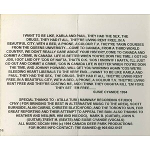 The tape is produced by St. Catharines-based Deer Park Productions (905-682-5107). Producer John Spenser and the band were very visible at the opening salvo of Bernardo's trial, flogging the tape at $4 a pop. The group considered singing the songs outside the courthouse but decided this would be in "bad taste." The tape is available on consignment in various shops in Toronto, like Vortex on Queen W.