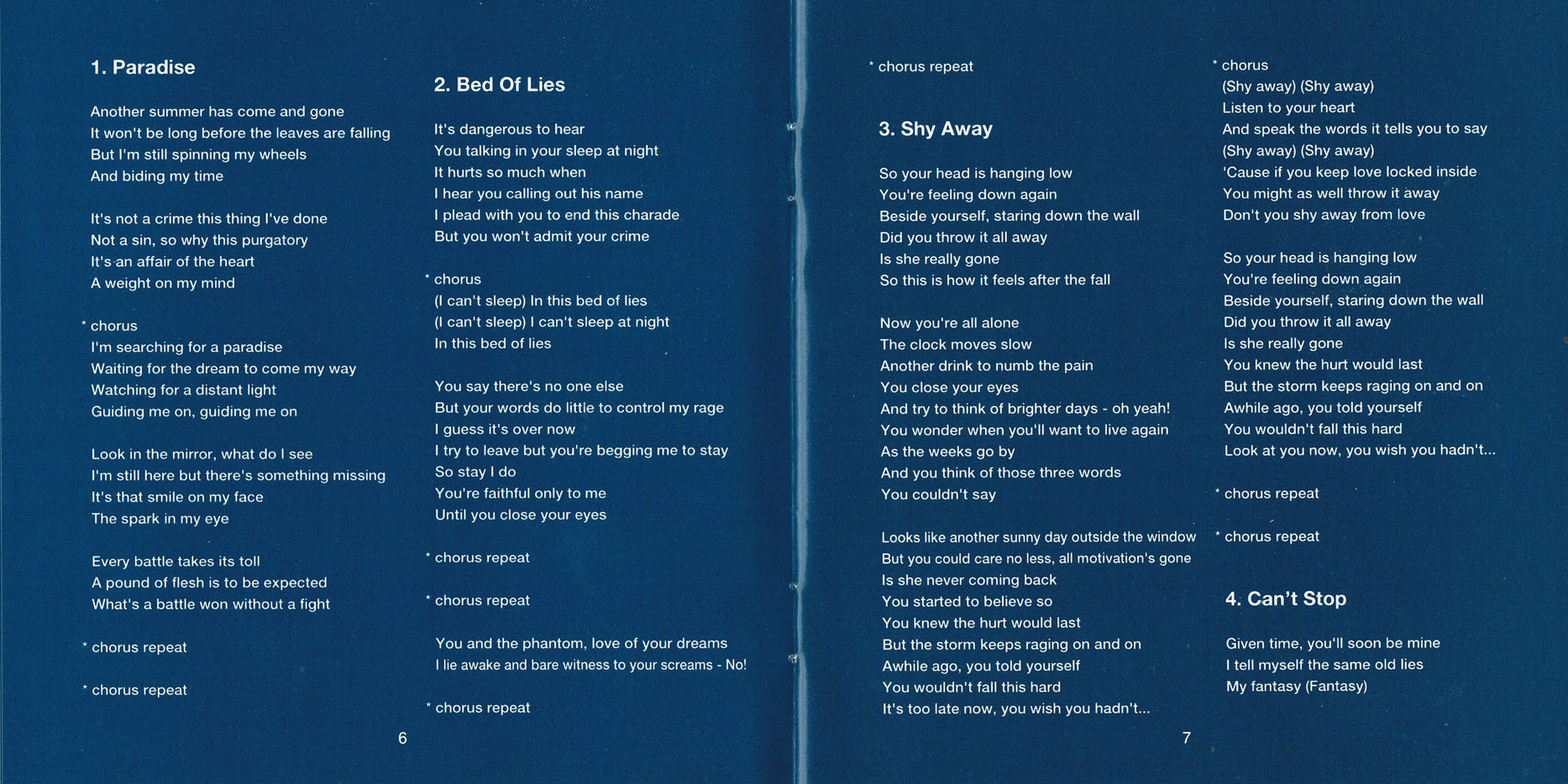 The first track, "Paradise" is classic Power Metal circa the 1990s; if you were around back then you'll get returned to those days as soon as you hear the opening notes. The song features beautiful guitar riffs, plenty of nice vocal harmonies, and heavy use of a synthesizer which is how things were done back in those days. It's the type of music I listened to in my late teens as well as my in my twenties and I am honestly surprised to find that I still enjoy some of it. This song is not exactly sophisticated, but it still sounds really, really good. "Bed Of Lies" starts out slower, with a more dramatic lead-in. It's a classic "she's cheating on me" song where the guy singing it is pleading with his lady to be faithful to him. It's pretty cliche, I know, but it actually works in this case, with plenty of pretty guitar hooks as well as a good vocal performance with lots of harmony. Reminded me a bit of DOKKEN as well as TRIUMPH. "Shy Away" is a true power ballad. It's sufficiently sweet without over-doing it. It's the restraint shown that really impresses me. The lyrics don't insult your intelligence or beat you to death with sentimental drivel. As an added bonus, the music itself is quite good, too. I actually did not mind the song, and since I have no heart whatsoever that should tell you a great deal....