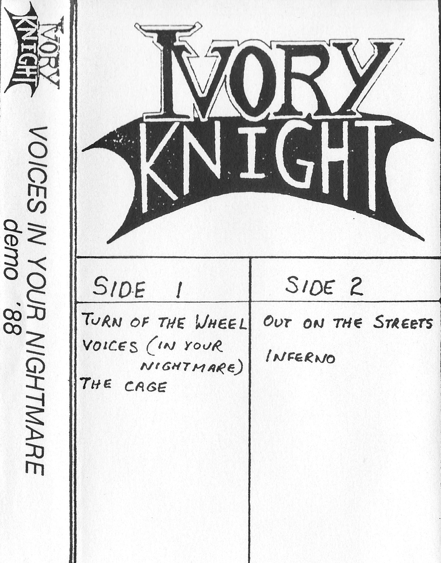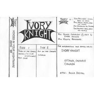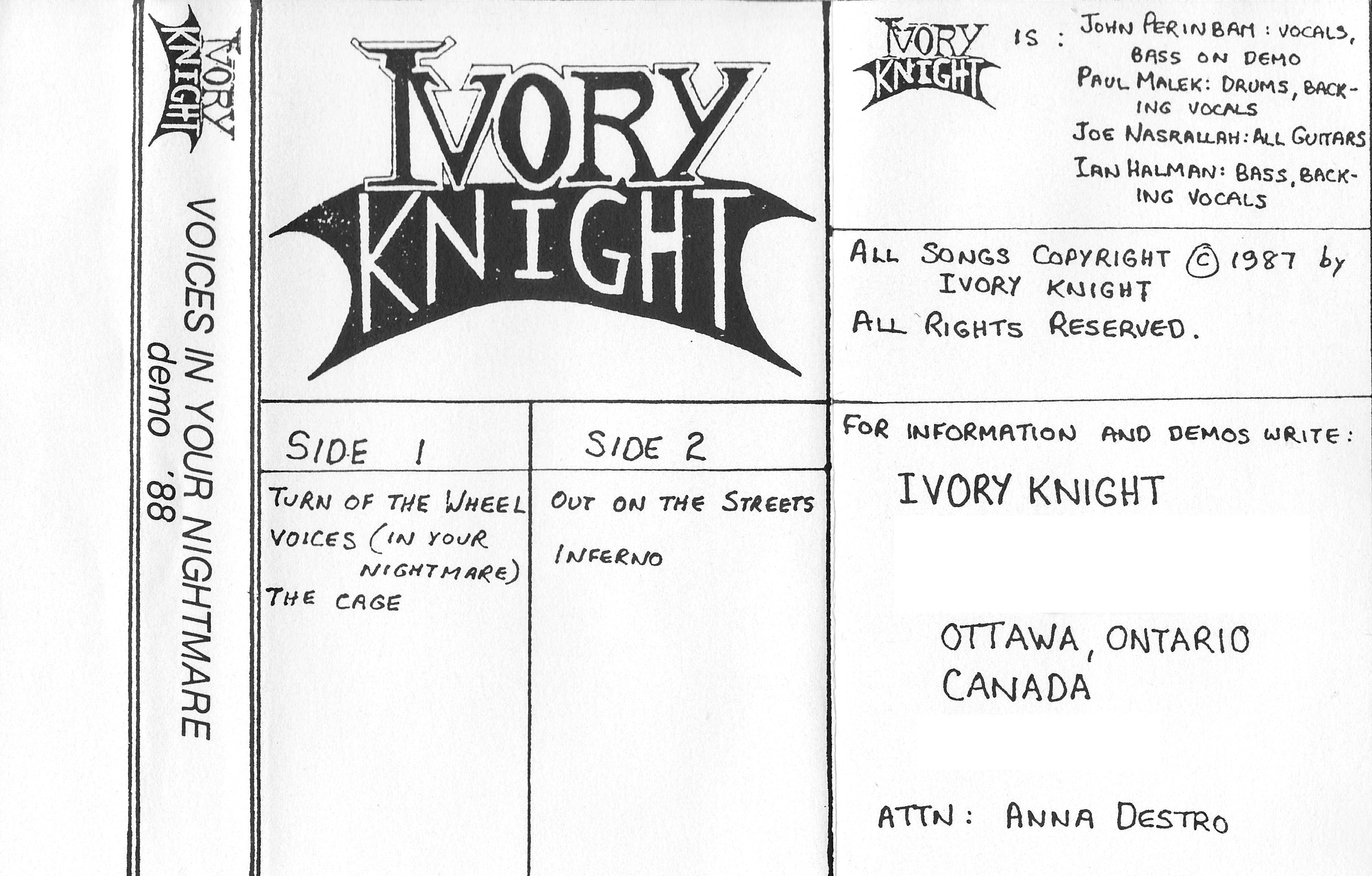 The band was founded by vocalist John Devadasan Perinbam, who initially teamed up with drummer Paul Malek, known for his work on early Annihilator demos, and guitarist Joe Nasrallah. The original intention was modest: rehearse, play a handful of summer gigs, and move on. However, after losing their bassist, Perinbam stepped in on bass and the group began writing original material. Those early songs were recorded on a four-track cassette machine and released in early 1988 as the demo Voices (In Your Nightmare). To the band’s surprise, the tape received strong reviews and airplay interest from underground metal circles around the world, firmly shifting Ivory Knight’s focus toward original music.
