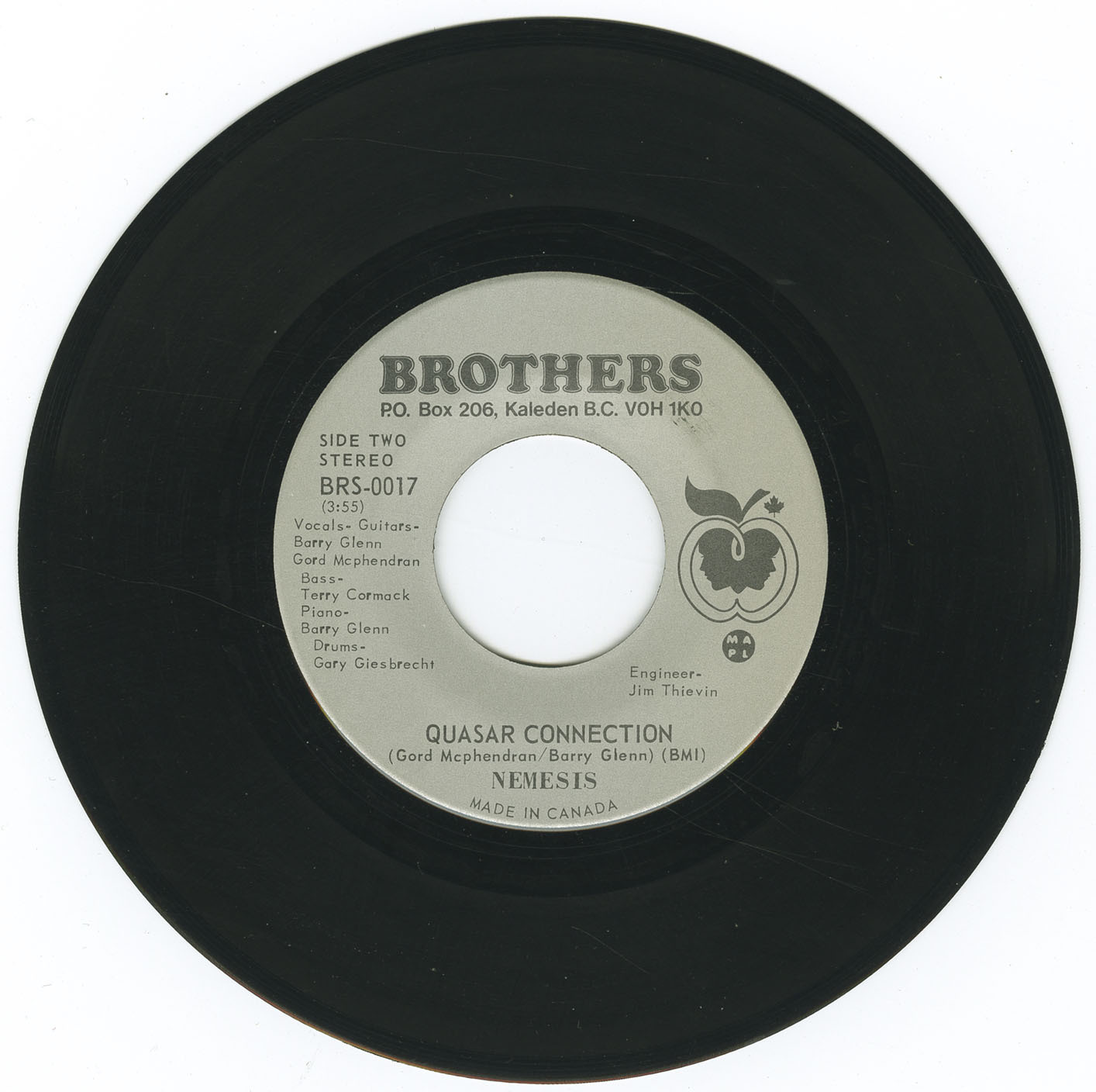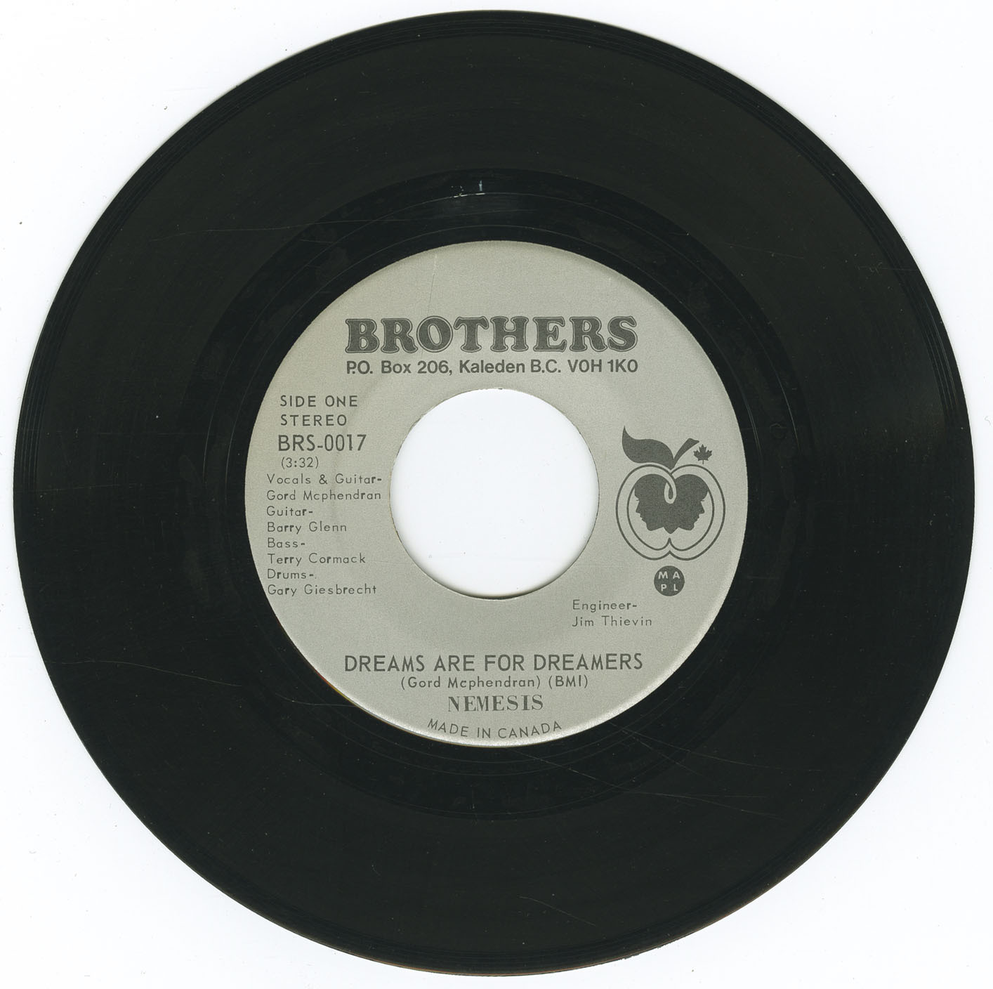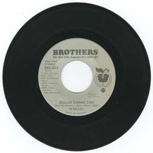 In 1973, Nemesis entered the studio to record two original tracks: “Dreams Are For Dreamers” (written by McPhedran), and the slightly more progressive “Quasar Connection” (co-written by McPhedran and Glenn). Both songs capture the warm, melodic tendencies of early '70s soft psych, blending acoustic textures, lush harmonies, and cosmic lyrical imagery. The single was issued on the private Brothers label (BRS-0017), engineered by Jim Thievin, and distributed locally in small quantities, making surviving copies highly sought after today by collectors of rare Canadian rock. Estimated value for clean originals now approaches $150.