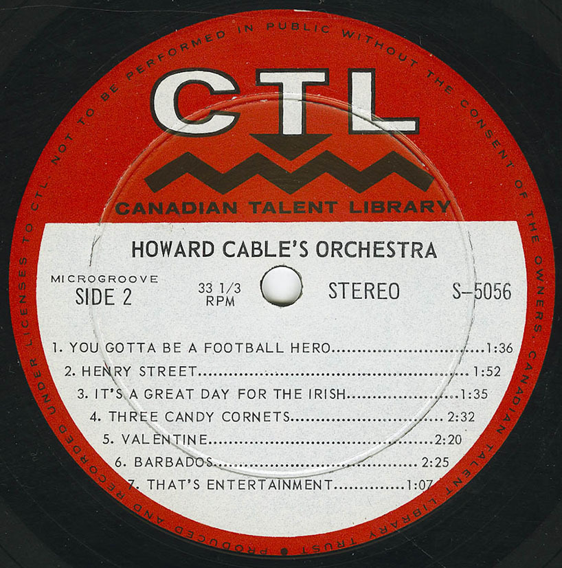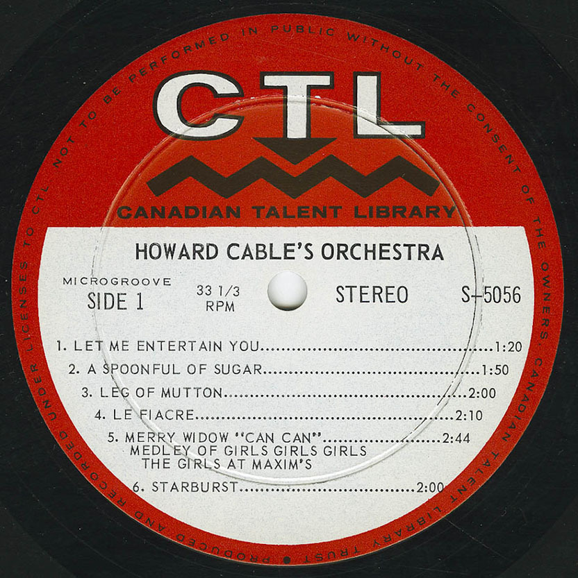Every bit of Howard Cable’s renowned musicianship shows in the spirited arrangements on this transcription. Whether sailing into the liveliest contemporary show tune like “Henry Street” from FUNNY GIRL, or “A Spoonful of Sugar” from MARY POPPINS—or entertaining with a diverting and original treatment of a novelty tune, such as “Le Fiacre” with its clip-clopping of hoofs and “Three Candy Cornets” (his own composition), Howard Cable’s brilliant individual touch remains in evidence. It’s a distinctive sound which has enlivened many a Canadian radio and television show—and every Canadian listener and viewer would have his own favourite from the formidable list. On radio, Canadian Cavalcade, Parade of Song, Comrades in Arms, Gisele and Mr. Cable, Voice of the Army and Mr. Showbusiness—among many others. On television, the Cable baton led memorable music for G.E. Showtime featuring Shirley Harmer and Robert Goulet. Visitors to the C.N.E. associate Howard Cable automatically with the annual Grandstand Show with all its drama, colour and musical excitement.