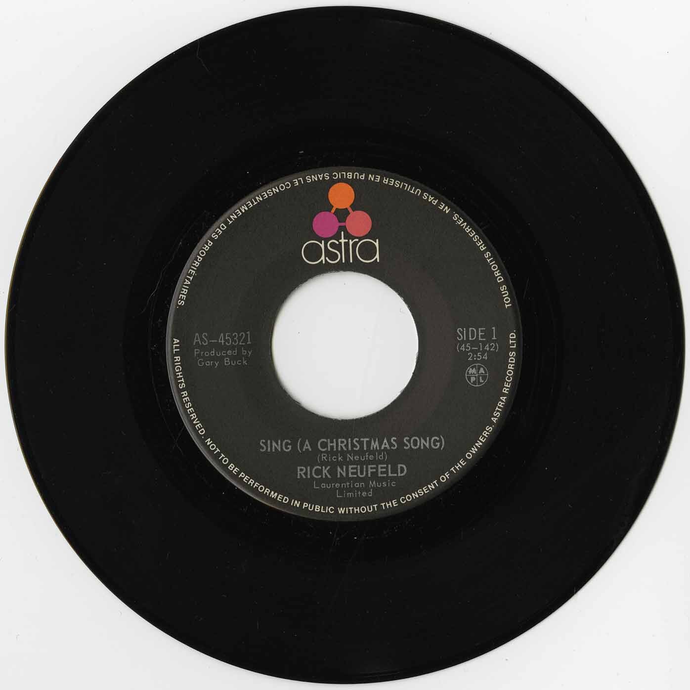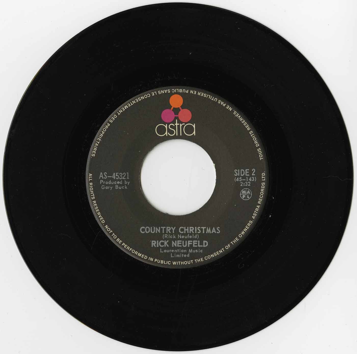 Published by Laurentian Music Limited (BMI). Issued by Astra Records Ltd. in December 1971, the single is marked as 100% Canadian content (MAPL) and represents Rick Neufeld’s contribution to Canadian Christmas recordings during the early 1970s.