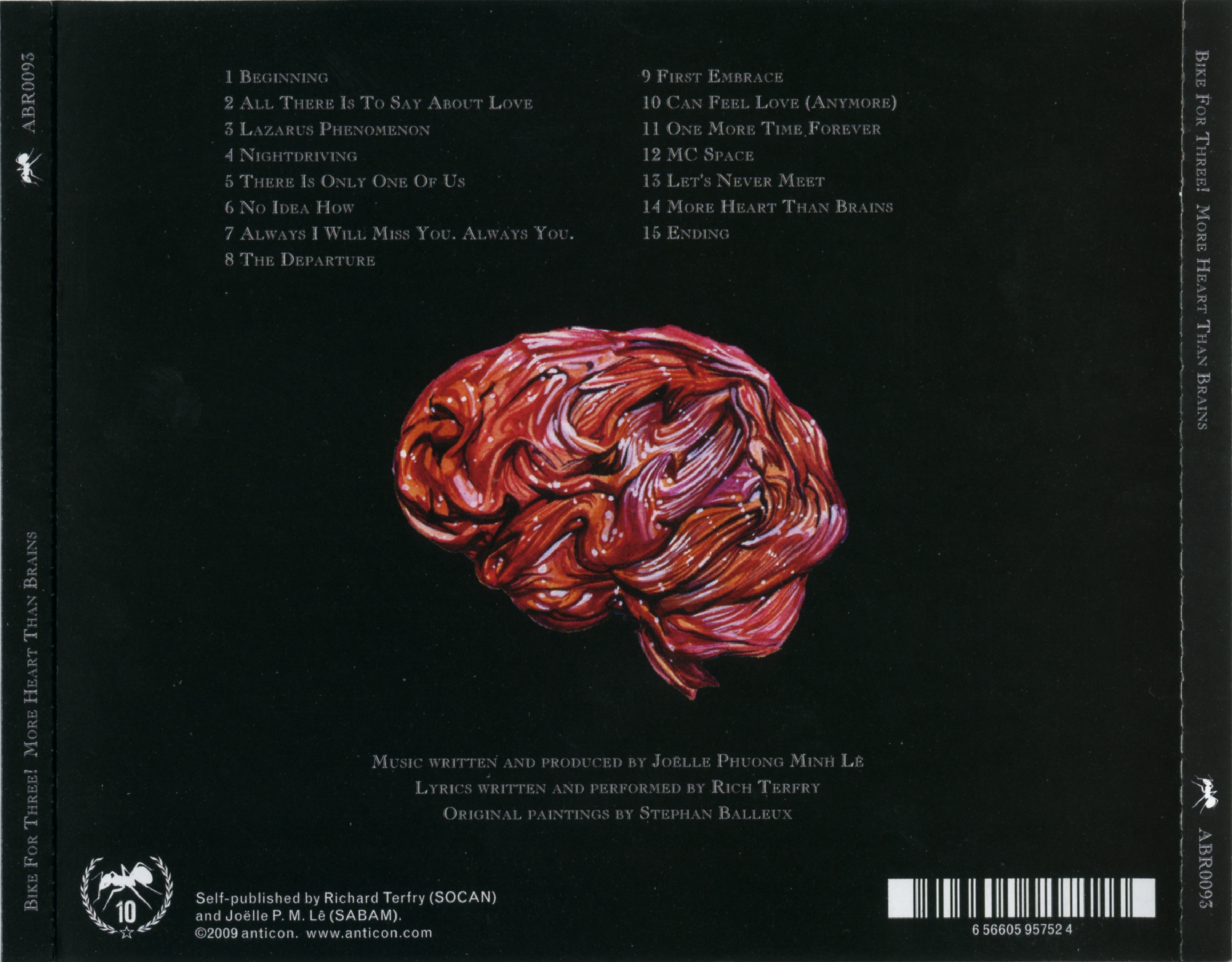 More Heart Than Brains, Bf3!’s album debut, is Buck 65’s first record to feature all electronic production. Of course, Joëlle has a few acoustic tricks up her sleeve—those music boxes from her youth, for instance—and an approach that seats her comfortably amongst such mercurial beat auteurs as Boom Bip, Modeselektor, Michna, and labelmate Alias. That Rich returns to Anticon a nearly decade later to release his most personal album yet is both an honor and the logical continuation of the label’s own story (Sage Francis did the same with Personal Journals in ’02). As for Bike For Three!, consider this Chapter One.