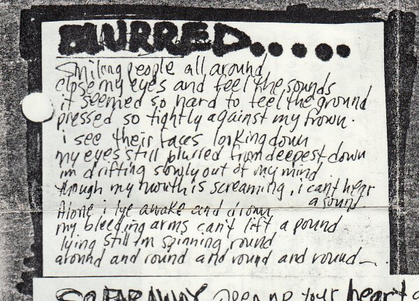By December 1990 we had ten songs together and wanted to record a tape. Our friend Chris Donnahee was able to borrow a cassette 4track from his highschool and he came over to our space on December 2nd to help engineer the session. We had a couple sm57 mics, four borrowed cheap Realistic (Radioshack) mics and a little Realistic 6 channel mixer. The guitars, bass and drums were recorded live into the 4track with 3 mics on drums going through the mixer into one track. We got the 10 songs recorded that day, then in the next week we worked on adding the vocals.
