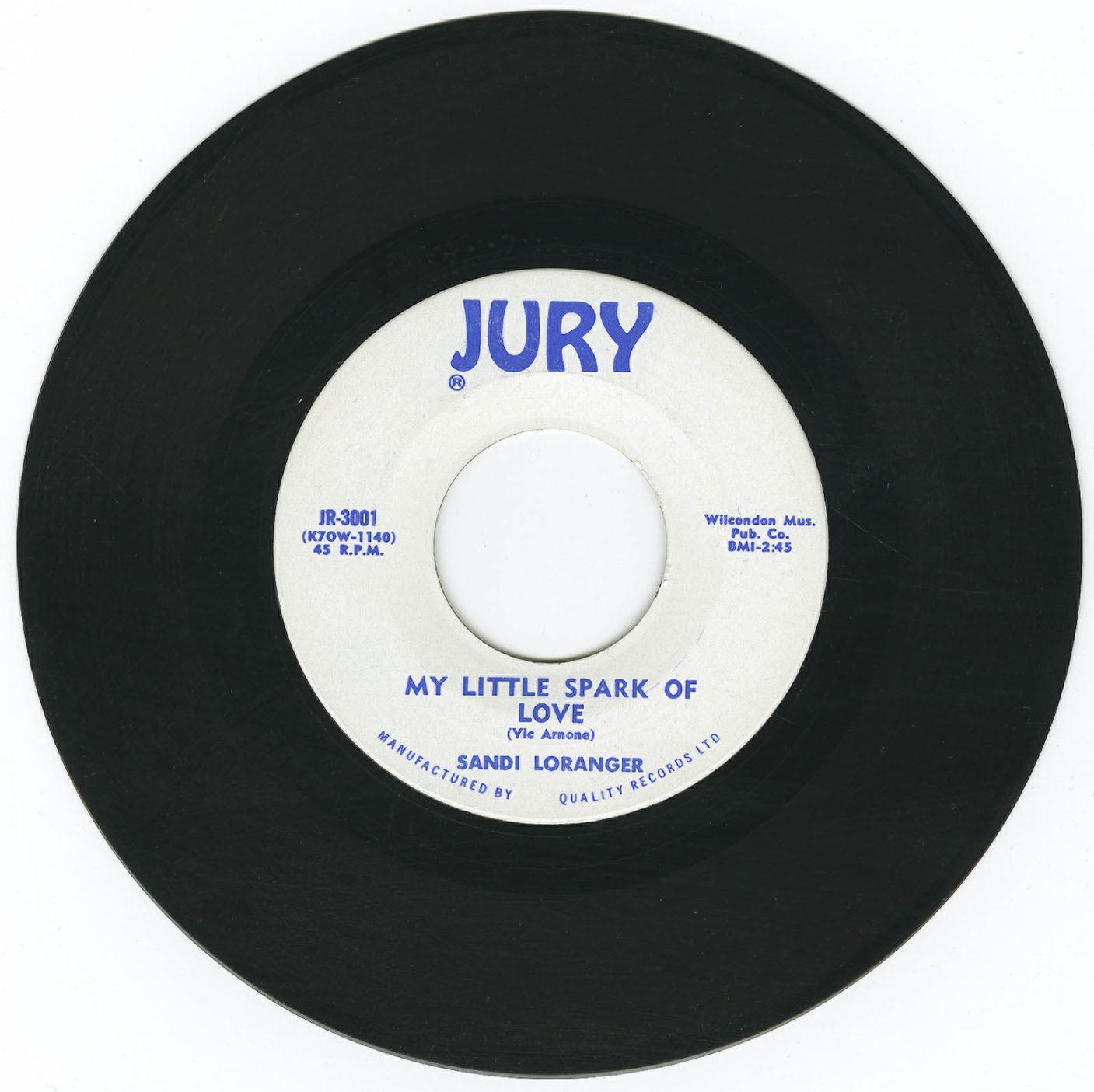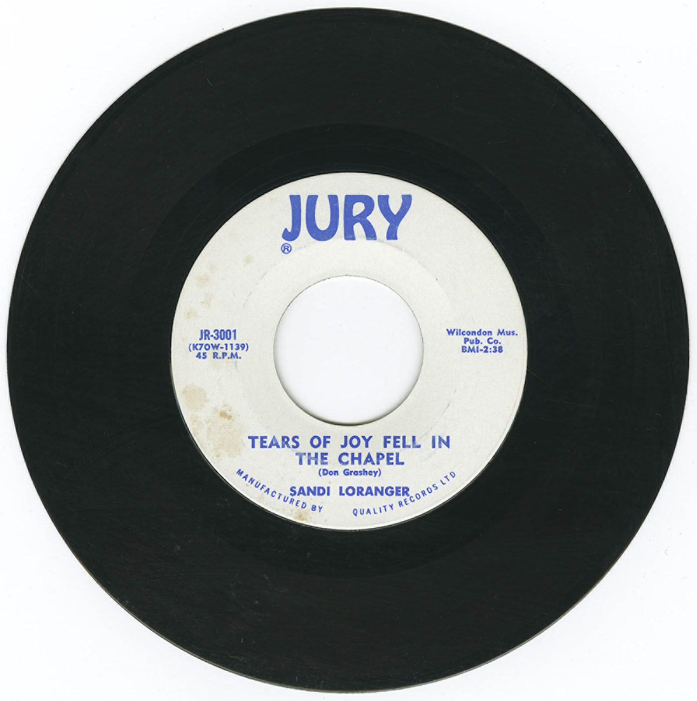 Sandi Loranger was 17 years old when Don Grashey and Chuck Williams took her to RCA studios in Los Angeles to record the single "Tears Of Joy Fell In The Chapel" b/w "My Little Spark Of Love". The record was pressed at RCA Record Manufacturing Plant in Los Angeles. Three thousand copies of the record were mailed out to radio stations. Tracks for a follow-up single were recorded at the time, but never released.