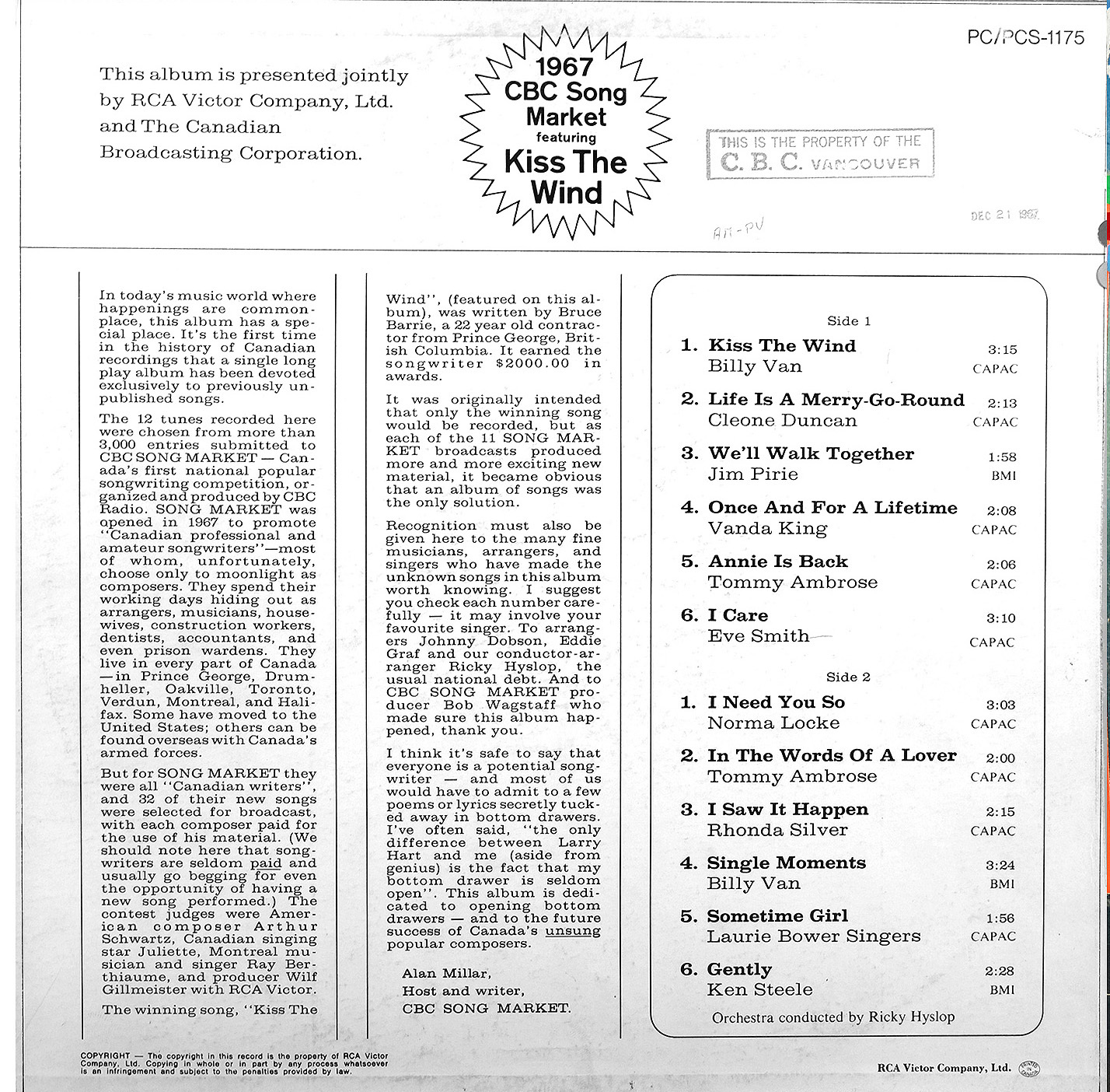Label: RCA Victor PCS 1175, CBC Radio Canada PCS 1175
