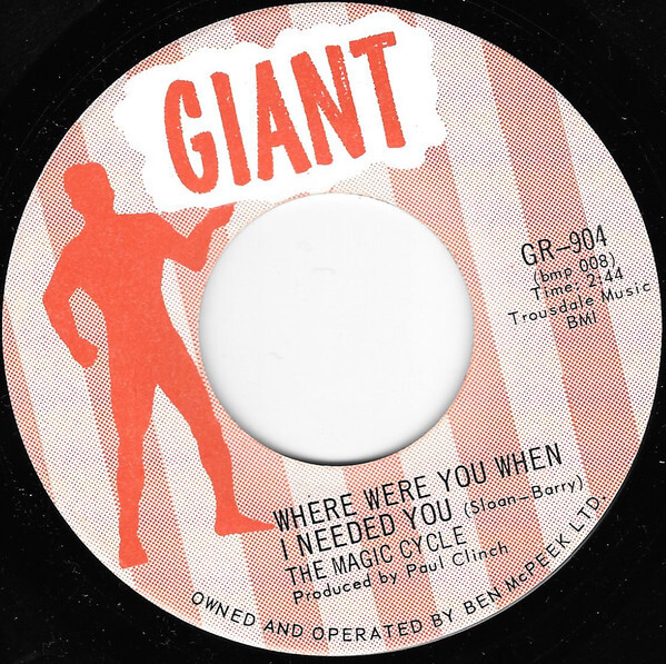 Red Leaf Records issued the first two Magic Cycle singles in 1967, “Let’s Run Away” backed with “Halfway to Heaven,” and “Give Me the Right” backed with “It Was You.” Tuneful and radio-ready, they kept the band visible beyond the GTA. A change in personnel followed: Santalucia departed, while keyboardist Pete Young and guitarist-singer Ken Johnstone came aboard. Late that year the group toughened its sound on Ben McPeek’s GIANT label with the psych-tinted “Doctor Lollipop” backed with “Where Were You When I Needed You,” tracked at Art Snider’s new Sound Canada Studios and giving Paul his first released writer/producer credit.