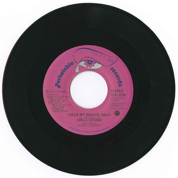 A decade later Guthrie returned with a second full-length, Call Her Lady Blue (Periwinkle PER-7331, 1978), again produced by Art Snider. Recorded at Sound Canada with a seasoned cast of Toronto musicians including Doug Riley, Brian Leonard, and Dave Classic, the album featured contemporary material such as Morris Albert’s “Feelings,” Gerry Goffin and Mike Masser’s “Theme from Mahogany,” Bobby Hebb’s “Sunny,” and a number of songs by Canadian writer Len Blum. The singles “Takes My Breath Away” and “Roll Your Love Along” received airplay, with RPM noting their release.