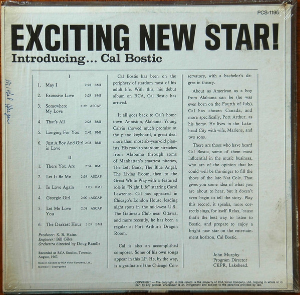 In August 1967, Bostic recorded his debut and only full-length album, Introducing… Cal Bostic, at RCA Victor Studios in Toronto. Produced by S. B. Hains, engineered by Bill Giles, and featuring orchestra direction by Doug Randle, the album presented Bostic in a polished pop and jazz-oriented setting, blending standards and original material. The record reflected RCA Canada’s interest in positioning him as a sophisticated vocal stylist in the tradition of Nat King Cole and other crossover pop-jazz performers.