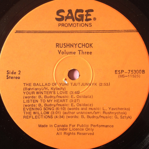 In their time together, Rushnychok recorded five albums comprised of 63 songs. The albums were all issued under the band's own SAGE Promotions record label (SAGE came from combining their names' first initials). The band's album sales could be counted in the tens of thousands - a rare feat compared to other North American "ethnic" acts. Amazingly, the albums also had a large impact in Ukraine where copies had to be secrectly snuck in.
