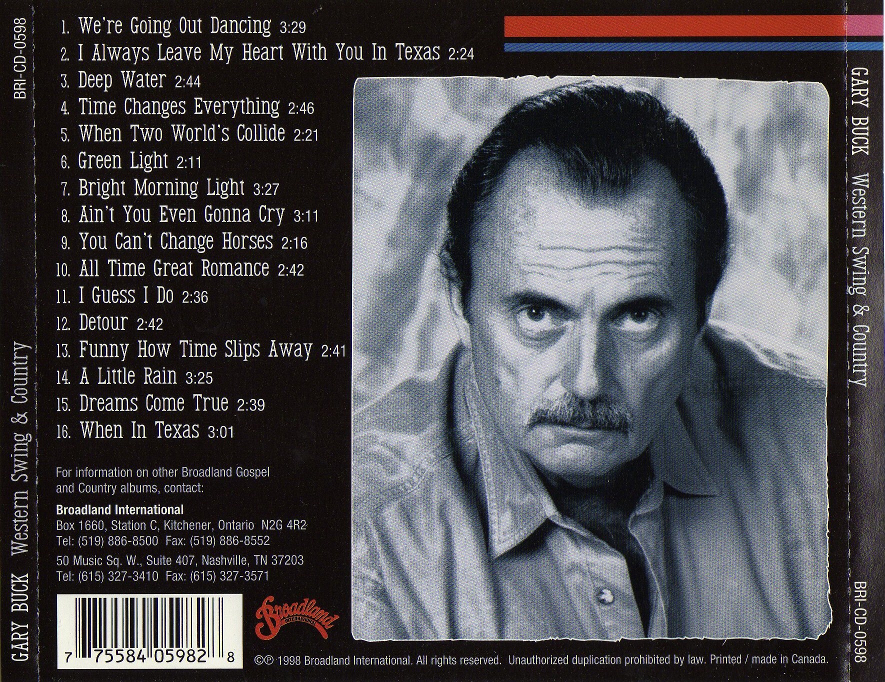 By the mid-1960s Buck had relocated to Kitchener, Ontario, where he became a household name on The Gary Buck Show on CKCO-TV. The series ran from 1967 to 1969 and further established him as one of the few Canadian artists with both chart credibility and television visibility. He appeared frequently on Canadian and American country television specials, and had the distinction of performing several times at the Grand Ole Opry in Nashville during the late 1960s and early 1970s. Even as he remained an active recording artist deep into the 1990s — releasing albums such as Western Swing and Country in 1998 and the gospel project Don’t Be Standin’ on the Outside in 2002 — Buck was increasingly influencing the industry from behind the console and behind the desk.