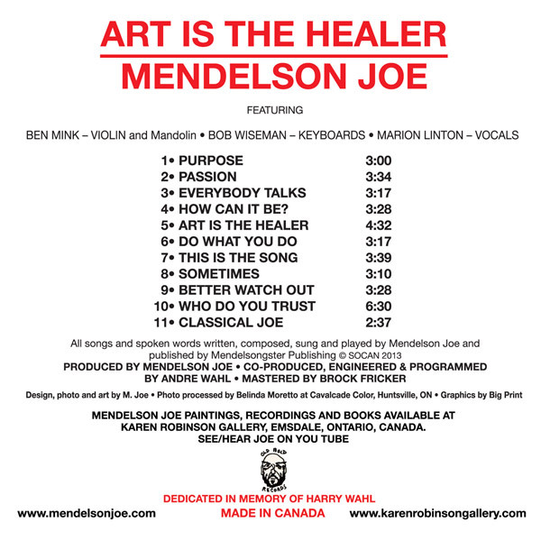 ART IS THE HEALER is Joe’s umpteenth album and features stalwart NOTABLES Ben Mink and Bob Wiseman. Joe’s an outsider in all genres (he’s an accomplished painter/penner). The ‘ART’ CD includes four brand new tunes and an assortment of oldies dating back to over five decades of songwriting. Silly, serious, and Bluesy.