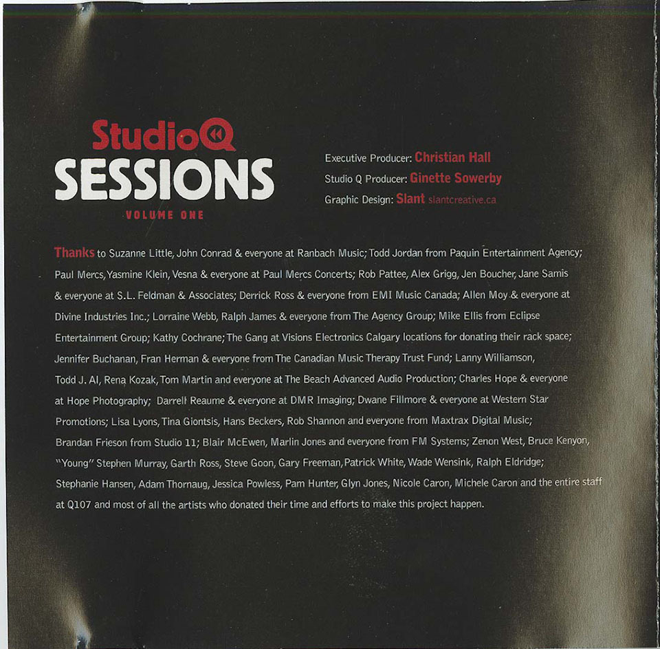 Suzanne Little, John Conrad & everyone at Ranbach Music; Todd Jordan from Paquin Entertainment Agency; Paul Mercs, Yasmine Klein, Vesna & everyone at Paul Mercs Concerts; Rob Pattee, Alex Grigg, Jen Boucher, Jane Samis & everyone at S.L. Feldman & Associates; Derrick Ross & everyone from EMI Music Canada; Allen Moy & everyone at Divine Industries Inc.; Lorraine Webb, Ralph James & everyone from The Agency Group; Mike Ellis from Eclipse Entertainment Group; Kathy Cochrane; The Gang at Visions Electronics Calgary locations for donating their rack space; Jennifer Buchanan, Fran Herman & everyone from The Canadian Music Therapy Trust Fund; Lanny Williamson, Todd J. Al, Rena Kozak, Tom Martin and everyone at The Beach Advanced Audio Production; Charles Hope & everyone at Hope Photography; Darrell Reaume & everyone at DMR Imaging; Dwane Fillmore & everyone at Western Star Promotions; Lisa Lyons, Tina Giontsis, Hans Beckers, Rob Shannon and everyone from Maxtrax Digital Music; Brandan Frieson from Studio 11; Blair McEwen, Marlin Jones and everyone from FM Systems; Zenon West, Bruce Kenyon, “Young” Stephen Murray, Garth Ross, Steve Goon, Gary Freeman, Patrick White, Wade Wensink, Ralph Eldridge; Stephanie Hansen, Adam Thormaa, Jessica Powless, Pam Hunter, Glyn Jones, Nicole Caron, Michele Caron and the entire staff at Q107 and most of all the artists who donated their time and efforts to make this project happen.