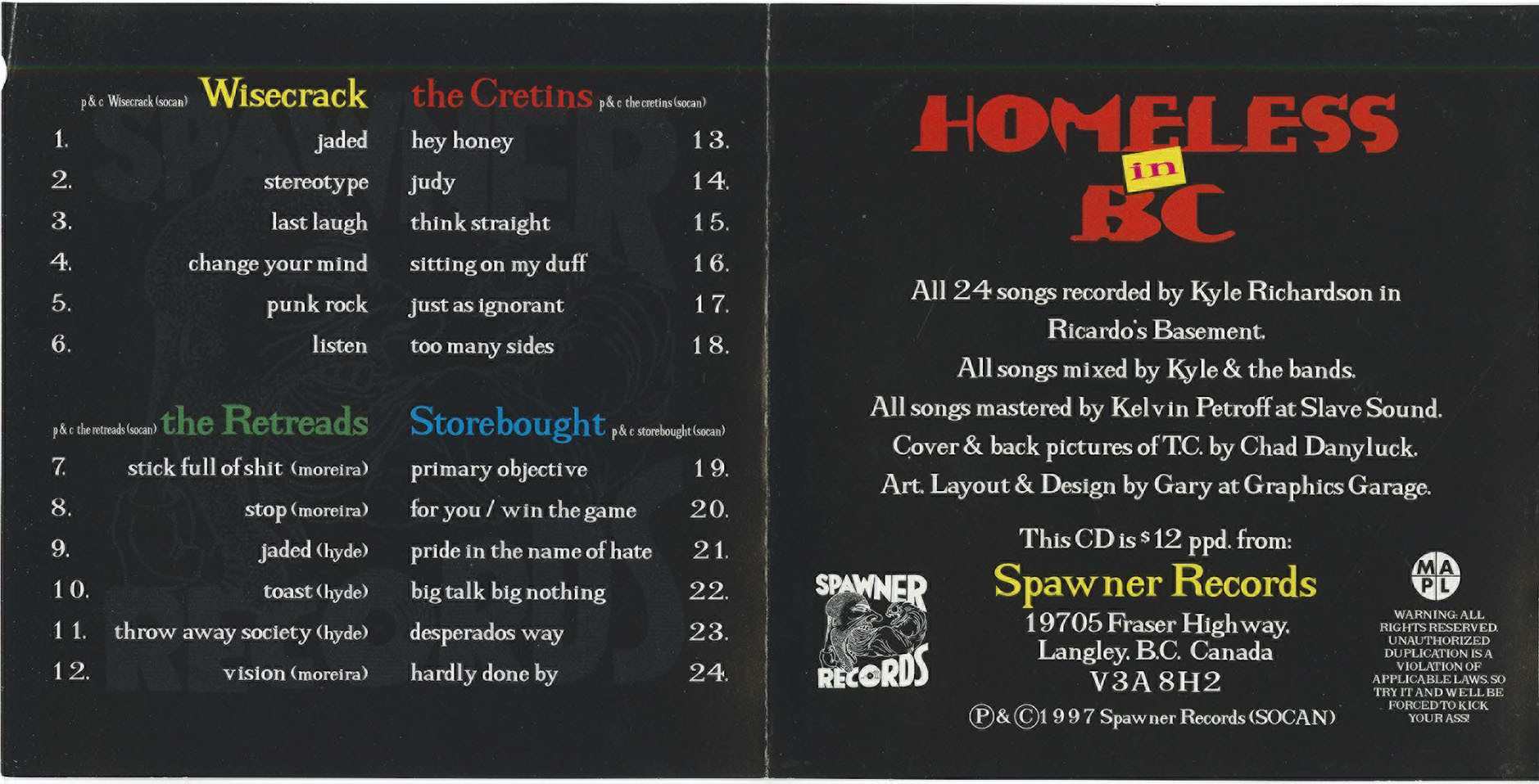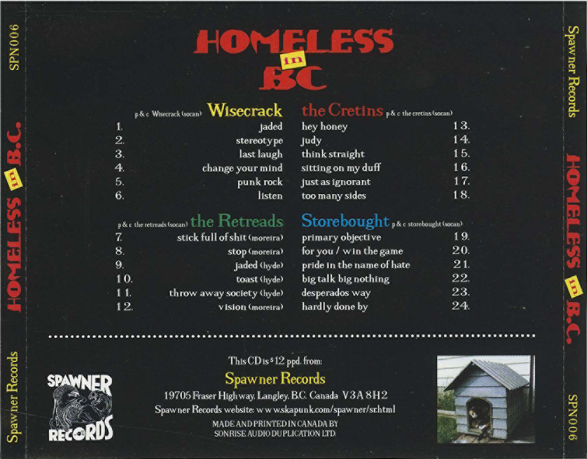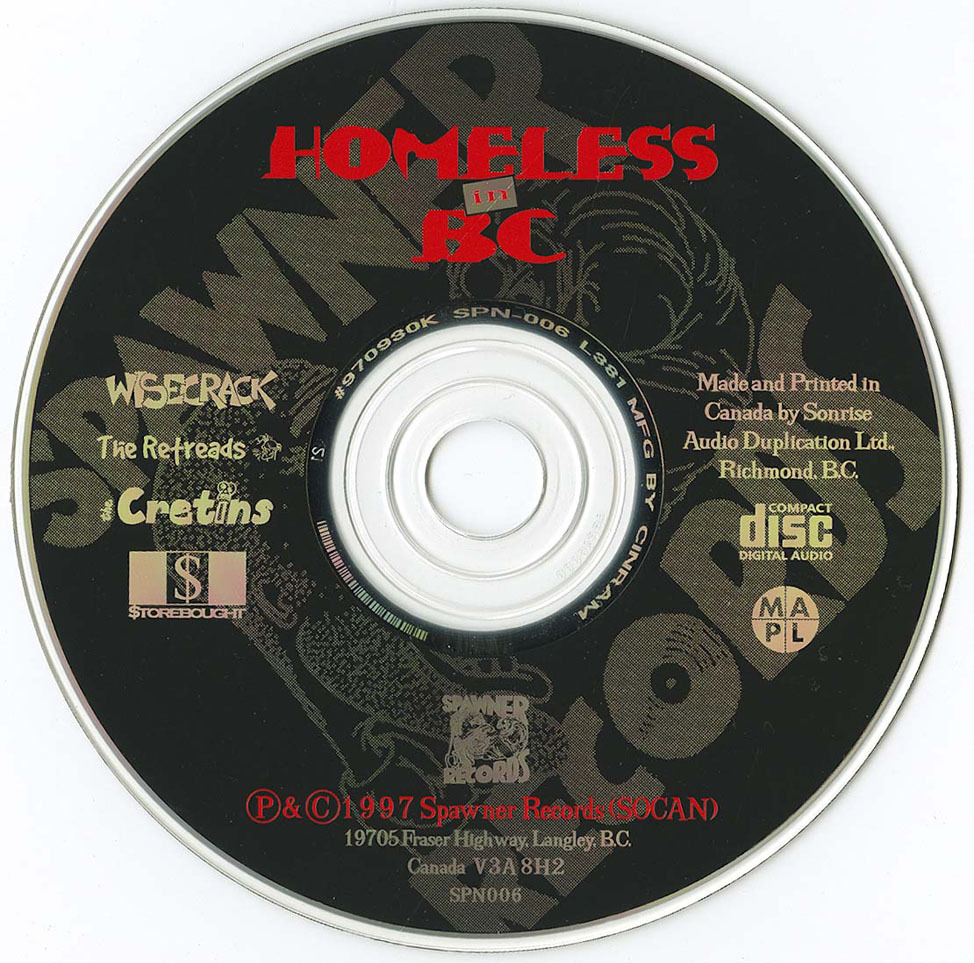 The four bands represented here are all from Langley or Surrey, and are, for the most part, pretty trad, Dad. Wisecrack are driving melodic hardcore that certainly wouldn't seem out of place on the Epitaph label. Strong vocals, beefy guitar (sometimes taking riffage cues from 80's Bay Area metal) and catchy changes are what this band is about. The Retreads are more of the same, but with a layer of grit and a more sing-a-long quality. Storebought take this a step further, and are a bit reckless, with English '77 type vocalisms thrown in for good measure. The Cretins, finally, are more, dare I say... gothic? They start with the same base as the other three bands, and then add Misfits-like "whoa-oh-whoa" harmonies to their aggressive power chords.