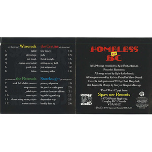 With Homeless in B.C., the first sampler from Wisecrack member Kyle Richardson's newborn label, Spawner, DIY has never been so well produced. The sound of these 24 recordings easily belie the fact they were recorded in Richardson's basement.