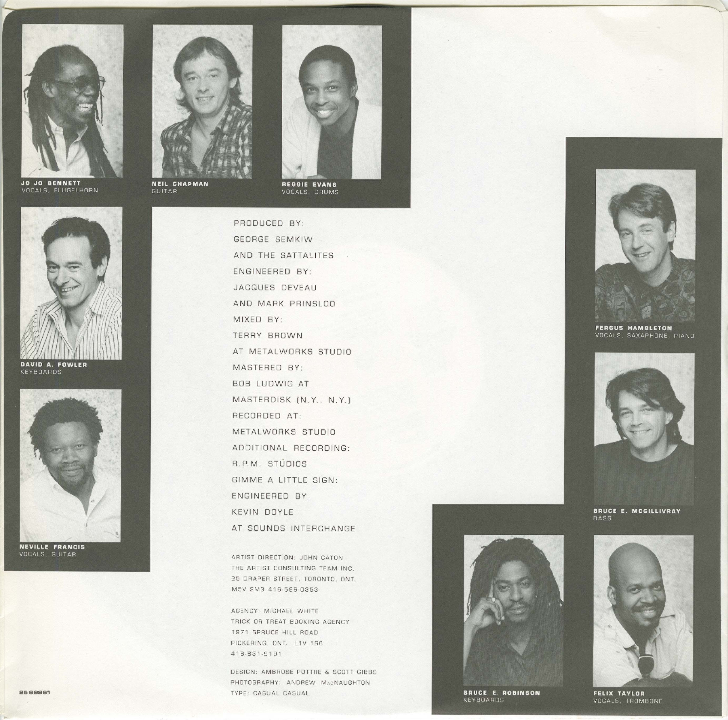 Fergus Hambleton has been the lead vocalist of the Sattalites since the band's beginning. He also plays the guitar, alto saxophone and the keyboard and has played in other bands including A Passing Fancy and the Ginger Group. Vocalist Jo Jo Bennett, a founding member of the group, also played the flugelhorn and percussion. The other six members are David Fowler (keyboards), Bruce McGillivray (bass), Neville Francis(rhythm guitar, backup, and lead vocals), Junior McPherson (drums and percussion), Rick Morrison (saxophone) and Bruce 'Preacher' Robinson (piano and vocals). During the 1980s and 1990s, Felix Taylor played trombone and sang background vocals. Neil Chapman was a member for their first three albums, playing lead guitar, and has also guested on later recordings as well live on stage.