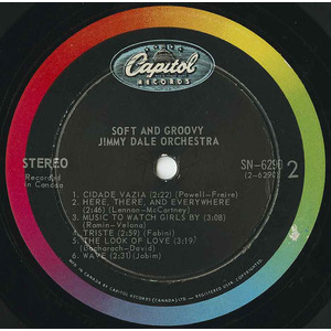 Groovy Canadian-only Capitol/CBC co-production instrumental LP featuring the talents of Guido Basso (trumpet), Ted Roderman, Rob McConnell (trombone), Jerry Toth, Moe Koffman, Eugene Amaro (flute & sax), Peter Appleyard (percussion), Ed Bickert, Jim Pirie, Sonny Greenidge, Lenny Breau (guitar), and Jimmy Dale (organ, leader, and arranger). Killer LP end-to-end with strong Brazilian and Beatles selections… Wow, great version of Milton Banana's "Cidade Vazia", you never see this! Great jazz bossa big band!