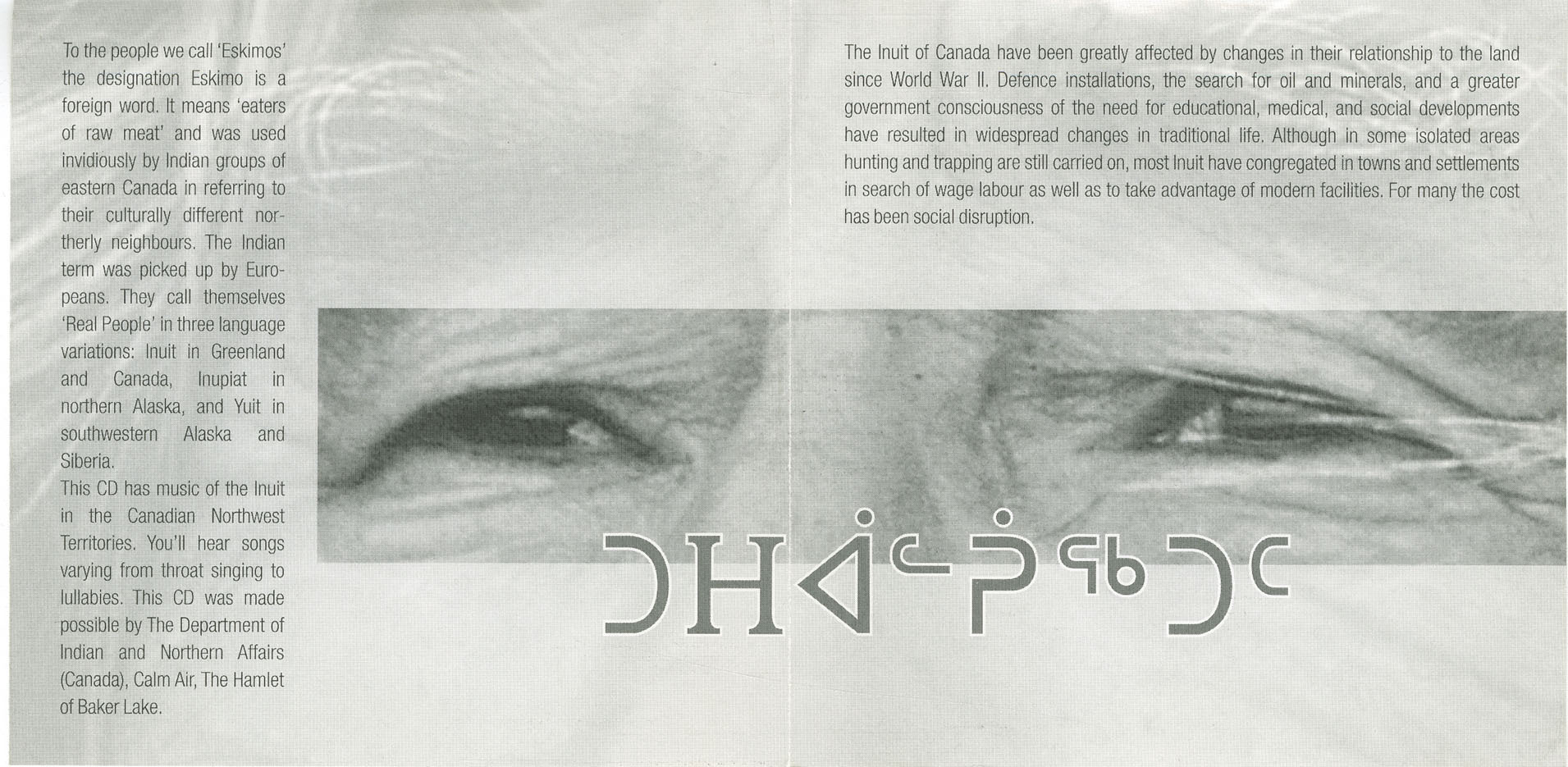 This CD has music of the Inuit in the Canadian Northwest Territories. You’ll hear songs varying from throat singing to lullabies. This CD was made possible by The Department of Indian and Northern Affairs (Canada), Calm Air, The Hamlet of Baker Lake.