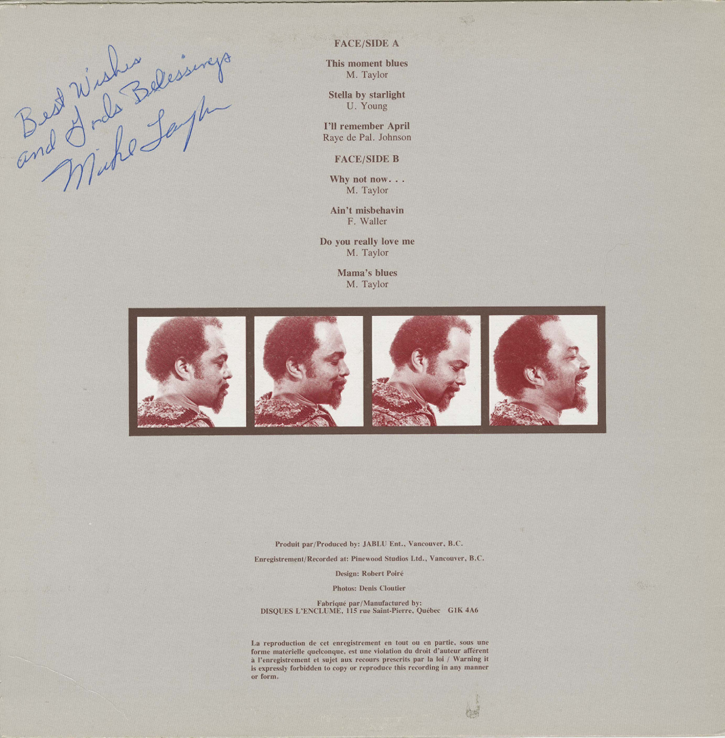 Recorded at Pinewood Studios Ltd., Vancouver, British Columbia
