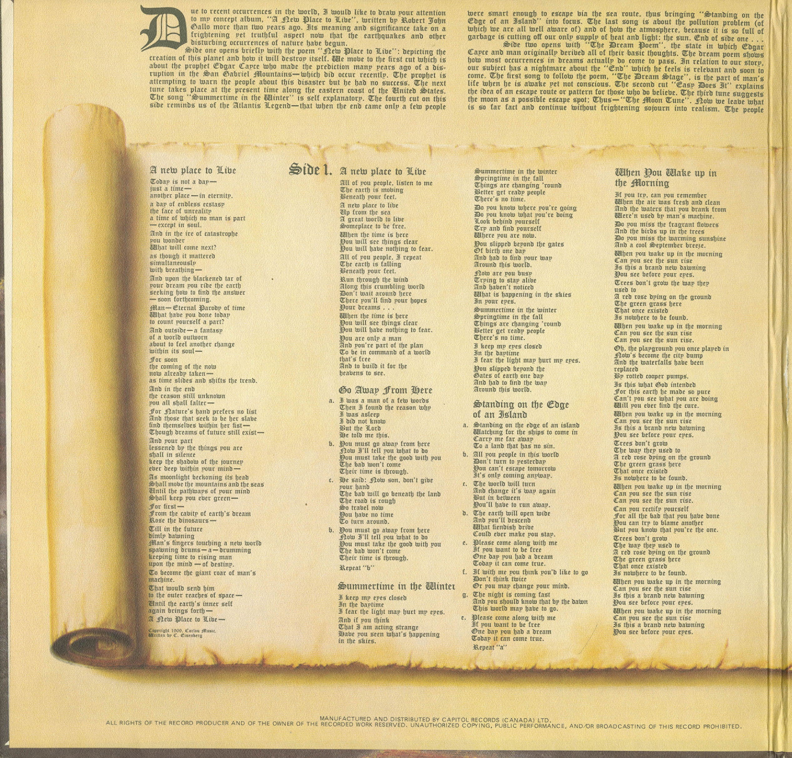 A New Place to Live was a concept album described by Bob Gallo as "Instead of just having music, I would have poetry, some acting and sound effects and incorporate everything all in one. A New Place to Live is based on the American clairvoyant Edgar Cayce The Sleeping Prophet having to do with the San Francisco earthquakes, what's happening with pollution, and how Mother nature's going to rebel." That same year, he released the albums 'Painted Poetry', and 'Compositions'.