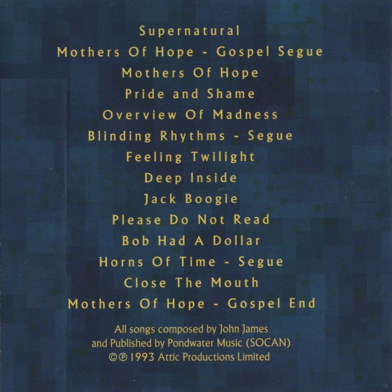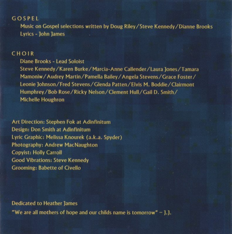 Mothers of Hope offers more substance than most in this vein. James' cool, casual party vibes are mixed with Gospel choir segues and lyrics that go far beyond hackneyed mating rituals. James has assembled a large ensemble of veteran Canadian players for Mothers of Hope, including the leading lights of such former domestic soul-pop hitmakers as Motherlode and Dr. Music. The cast smolders nicely. The title track sets the album's upbeat theme -- that each of us is responsible for passing on the good in life to generations that come. Without getting preachy, the disc works up a potent instrumental and lyrical ecstacy that is rather captivating.