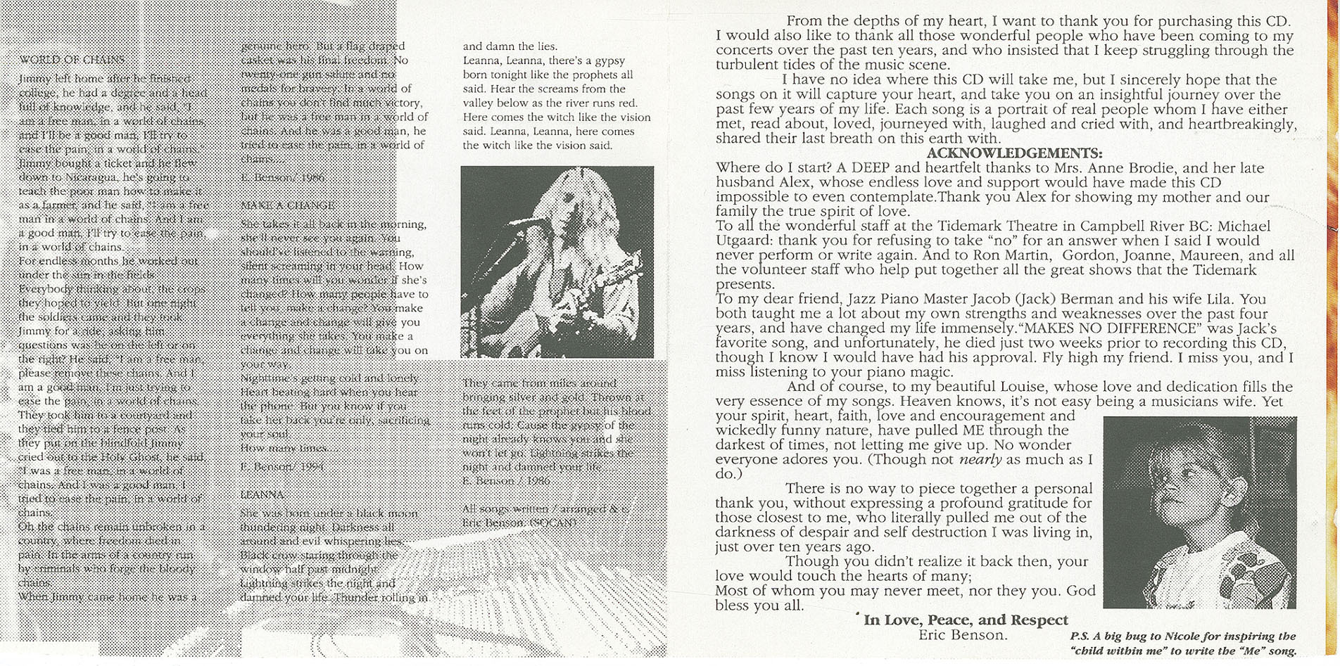 Shortly after its release in 1997, Eric Benson’s first CD “Close the Door”, gained accolades from veterans in the music world, and received airplay on FM, college radio and AM stations here in BC, and on budding internet radio stations and music sites worldwide. The “Door” is actually a window into the soul of this gifted artist. Eric is known for his ability to put pure emotions onto paper, and capture an audience within the songs striking melodies, and his soothing vocals. He has shared the stage with music icons Amanda Marshall, Ian Tyson, Juice Newton, Valdy, Queen of slide guitars Ellen McIllwain, and Roy Clark, to name a few.