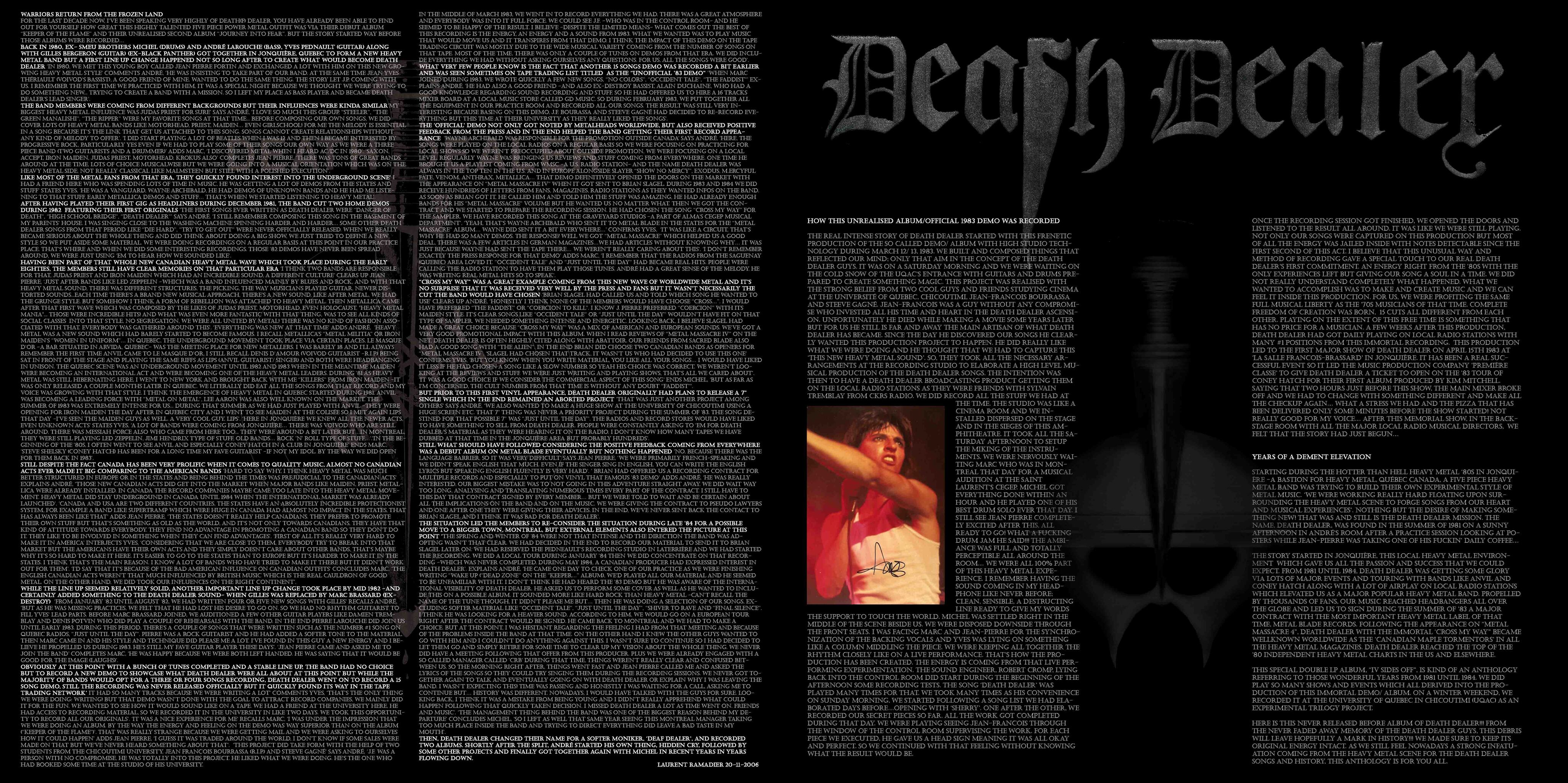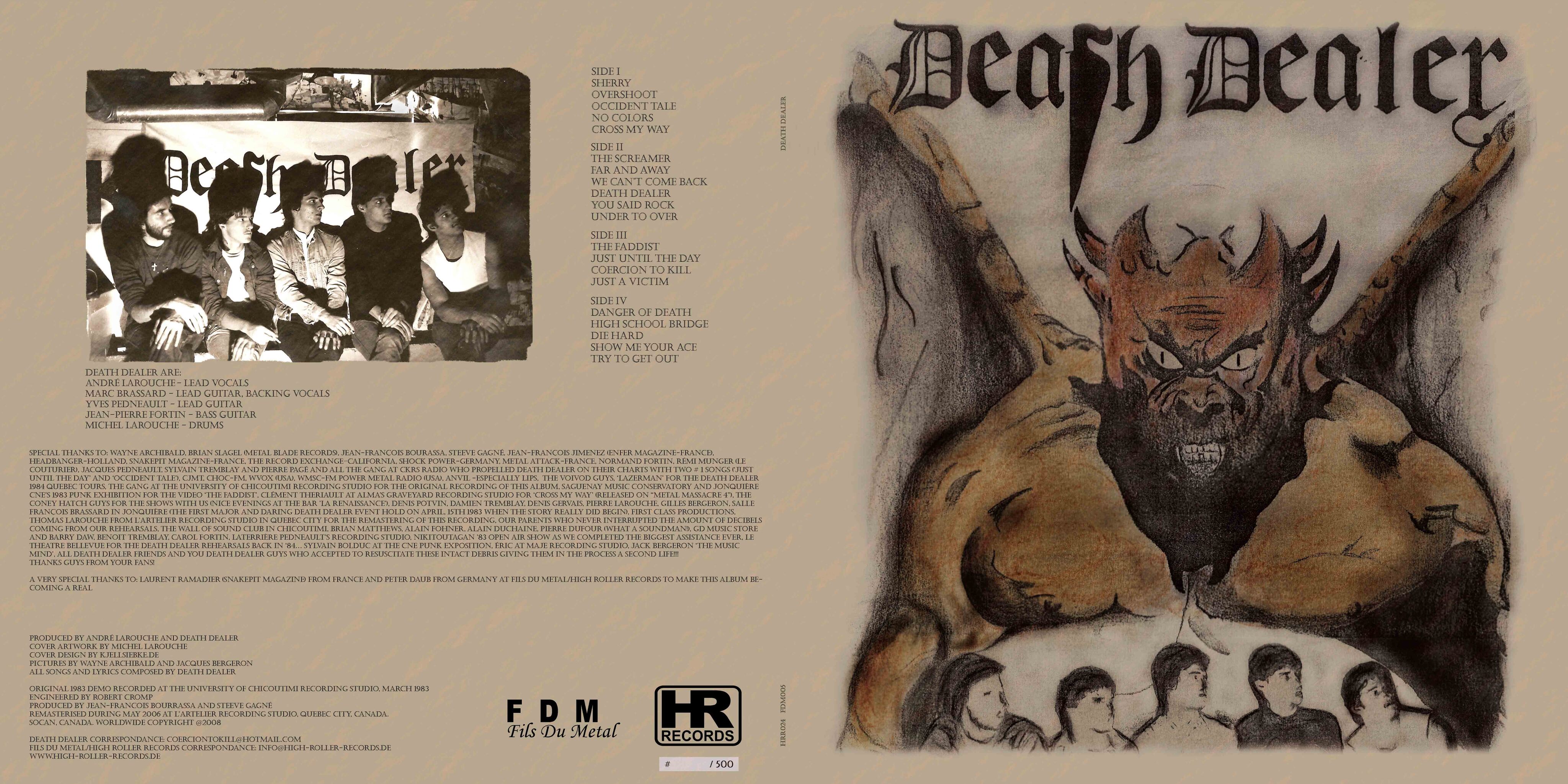 This special double LP album, “IV SIDES OFF”, is kind of an anthology referring to those wonderful years from 1981 until mid 1984. We did play so many shows and events which all derived into the production of this immortal demo/ album. On a winter weekend, we recorded it at the University of Quebec in Chicoutimi (UQAC) as an experimental trilogy project. The side IV of the album includes 5 never released songs from the band recorded in the baseman of St. Mary's church in Jonquière, were we had practiced locally at that time. It was recorded just before Gilles Bergeron had left the band in July. The song 'Show me your Ace' was first named 'Pearl Harbor' when we composed it. That year, Death Dealer was creating music that led to a new and original heavy metal sound.