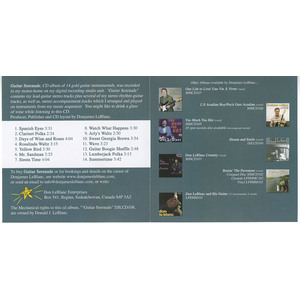 GUITAR SERENADE released May 2005 by Donjames LeBlanc is a Compact Disc Album of 14 GOLD ‘classic’ Guitar Instrumentals. It was recorded on location at Donjames’ DJL digital recording studio. “Guitar Serenade” contains several lead-guitar stereo tracks plus several stereo rhythm-guitar tracks by Donjames, as well as stereo accompaniment tracks arranged, produced and played on music-sequencer instruments. This is a very ‘clean’ relaxing Compact Disc! You might even want to dance!
