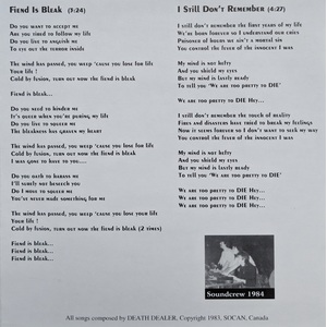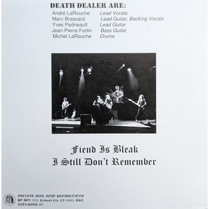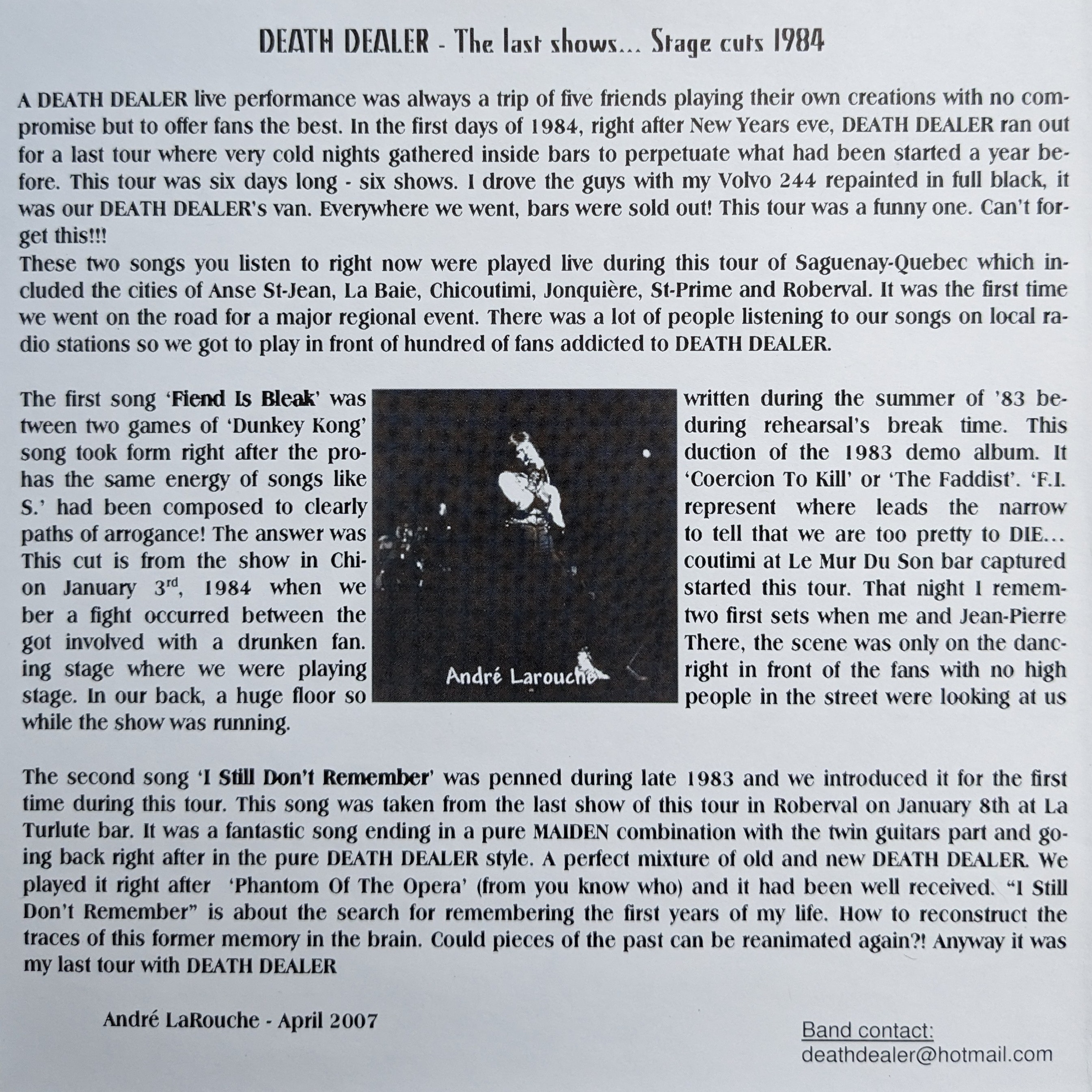 The ‘B’ side is the newcoming song ‘I still don’t remember’ composed in the late 1983 and that we presented for the first time in this tour. The text was at the final revision so an inversion of was we can say’ I don’t still’ instead of ‘I still don't 'occurs in this version played during the show. This song was taken from the last show of this tour in Roberval the January 08 at ‘La Turlute’. It was a fantastic song with its solo part ending by a pure Maiden combination of the two Guitars and remaining right after in the real Death Dealer style. A perfect mixture of old and new DD sound. Even for the first time playing, fans immediately adore this song. We played this song right after ‘Phantom of the opera’ from Maiden and it has been well received. I still don’t remember is the search for the remembering of the first years of my life. How to reconstruct the traces of this formatting memory in the brain. Should pieces of the past could be reanimated again! And after so many tries ‘I still don’t remember’…But only for the past of Death Dealer!!!
