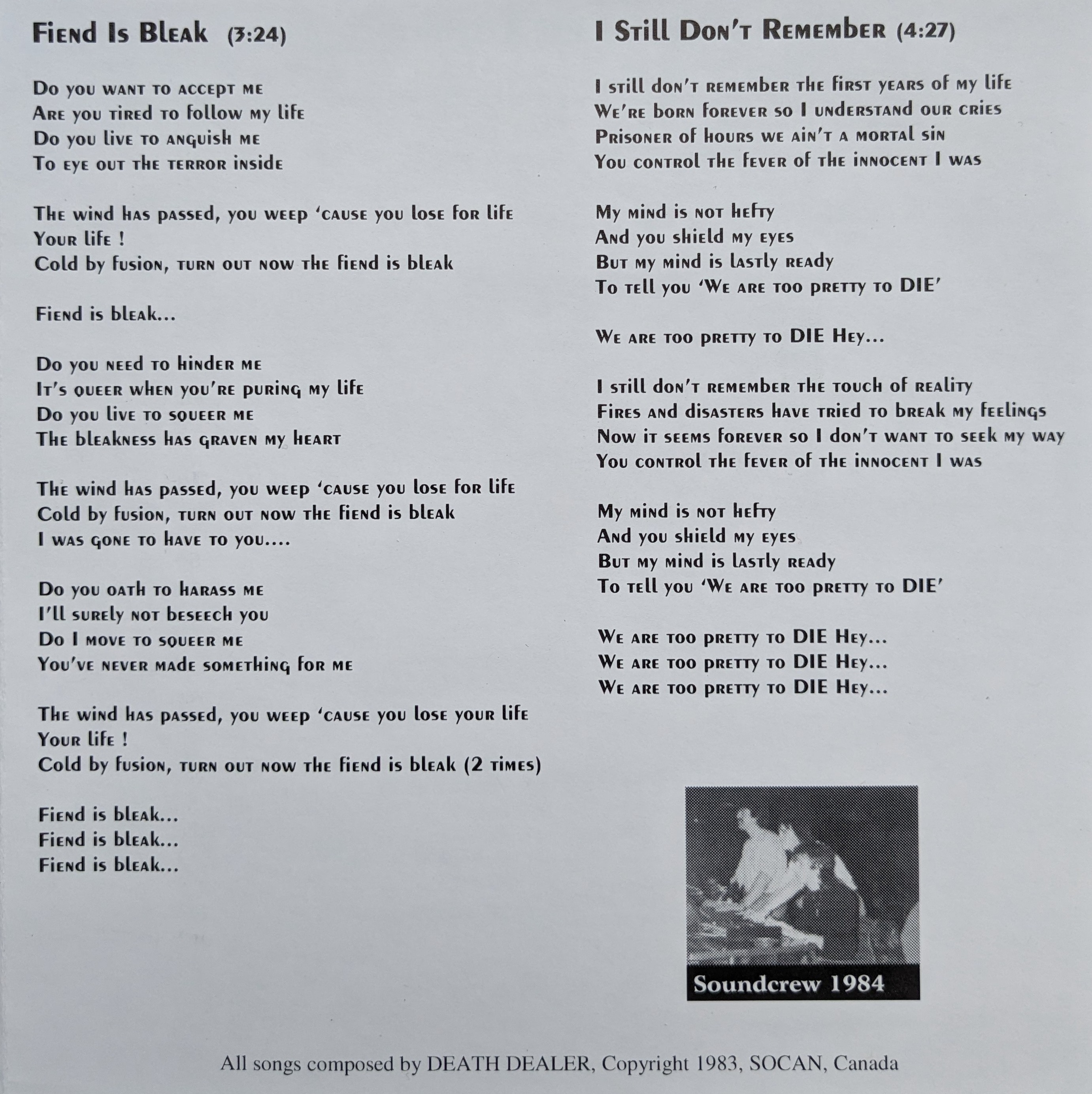 The first song ‘Feind is Bleak’ was composed in the summer of ’83 between two games of ‘Donkey Kong’ in the break time of a rehearsal. This song went off right after to the production of the 1983 demo album including the firsts 15 songs of Death Dealer. It is still in continuity with the energy of songs like ‘Coercion to kill’ and ‘The Faddist’. ‘Feind is bleak’ is the bad side of the melody, the dark side of the earth, the sad side of every side… It has been composed to clearly represent where leads the narrow paths of arrogance! The answer was to allegate that we are too pretty to DIE…This cut is from the show in Chicoutimi at ‘Le Mur du Son’ January 03, 1984, where we opened this tour. That night I remember a fight occur between the two first sets when Jean-Pierre and I was involved with a drunk fan. There, the scene was only on the dancing stage where we were playing right in front of the fans with no kind of stage to elevate us. In our back, a huge floor in so people in the street were looking at us while the shows was running.