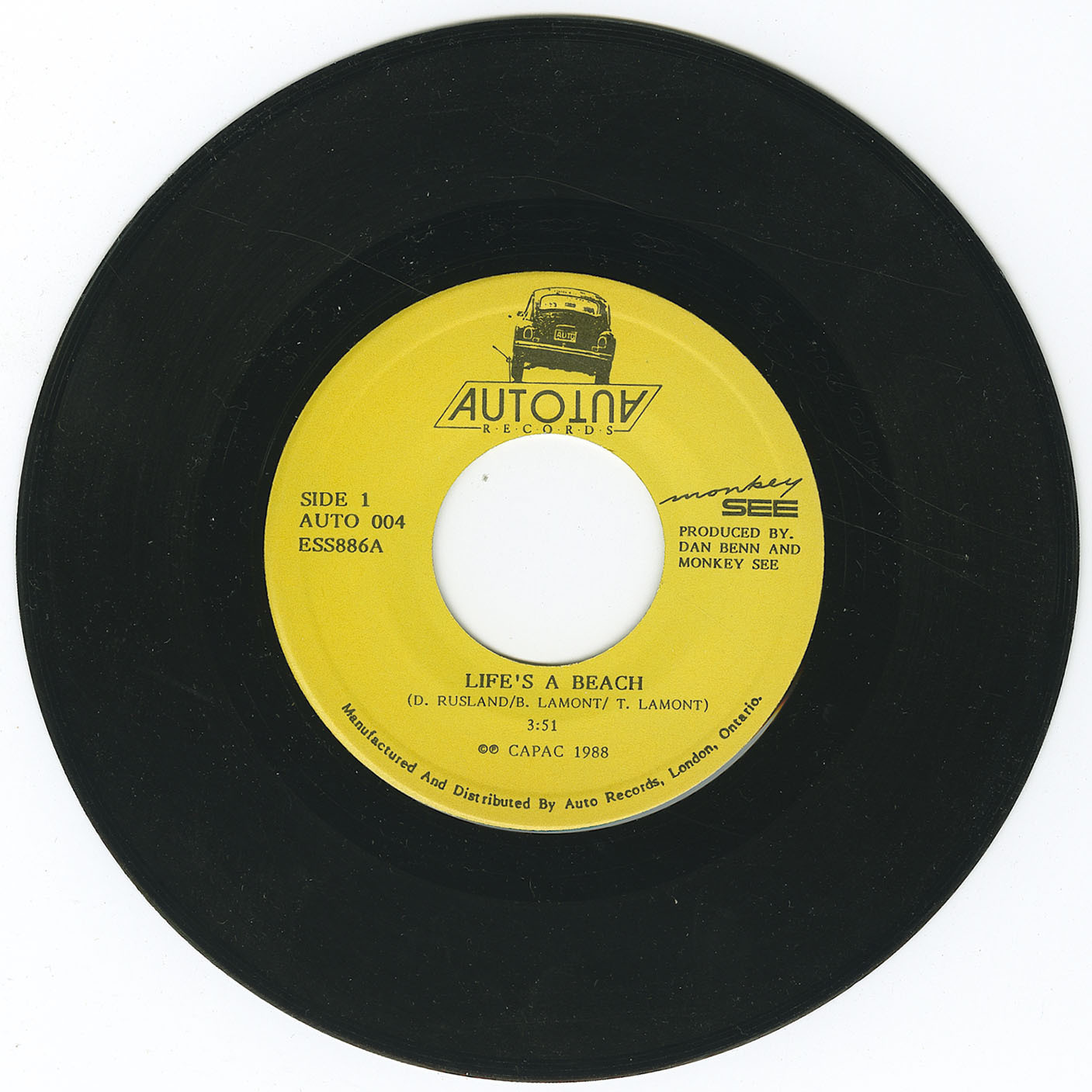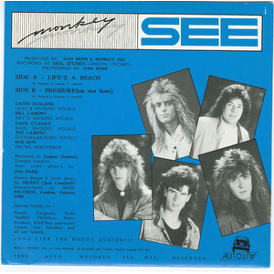 That spotlight arrived in the summer of 1988, when Monkey See appeared on CKSL Radio’s nightly Battle of the Bands. They won five straight nights, earning the top local ranking in July, a streak that pushed their debut single, Life’s a Beach, into regular rotation on CKSL. Recorded at Reel Studios and released independently on Auto Records, the track showcased the band’s polished AOR approach, pairing tight rhythm work with what Rusland called an “INXS-type groove with Tubes-style vocals.”