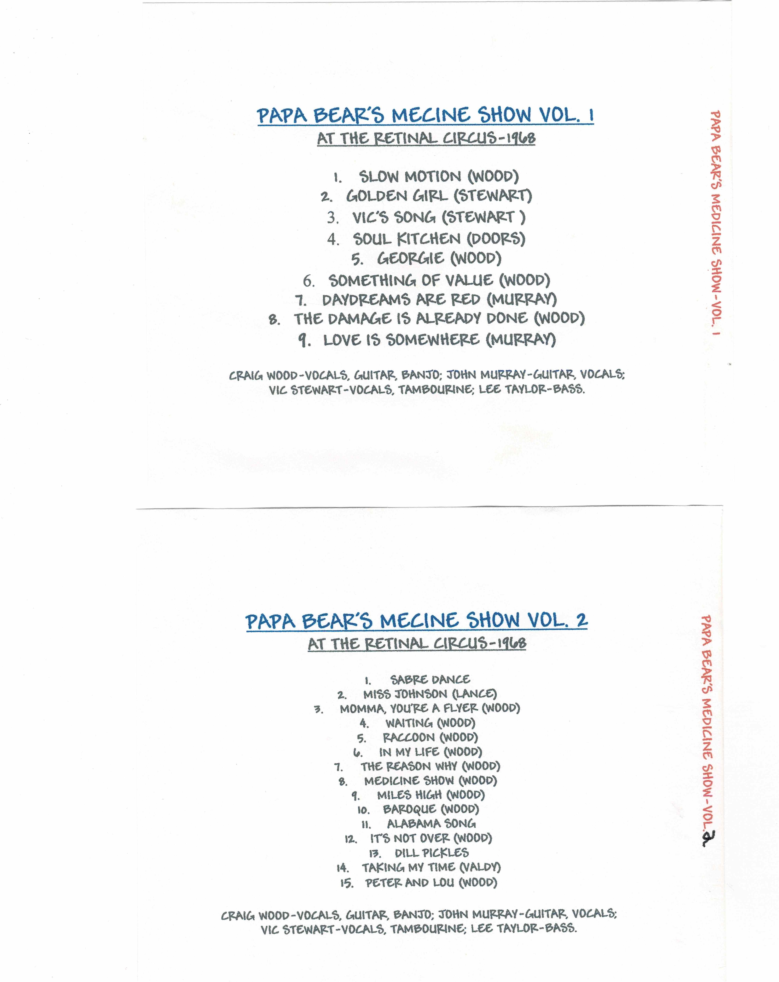 From John Murray's master tapes - here are the 24 tracks transferred by John Lyle and presented, with John Murray's agreement, by Robert Williston only here at citizenfreak.com - for the most part these are previously unreleased tracks of live recordings from The Retinal Circus from 1968 (there is some overlap with Medicine Show at the Retinal Circus CD on One Shot 002, released 2003 but these are different mixes). Papa Bears Medicine Show were probably second only to The Collectors for musicianship. John Murray was the instrumental heart of the group. He had a falling out with their manager and when he left they replaced him with Robbie King, who was a heavy keyboard player. The group didn't last much longer after that. John Lyle recalls: "Susan Jacks told me that the members of Nirvana told her that John Murray was the best guitarist they had ever heard. I agree, and I was so fortunate to be able to work with him for so many years. The last thing we did together (“We Must Be Patient” in 2020 when Covid hit) features what I consider some of his finest playing". John Murray resides in a care home in Burnaby, British Columbia.