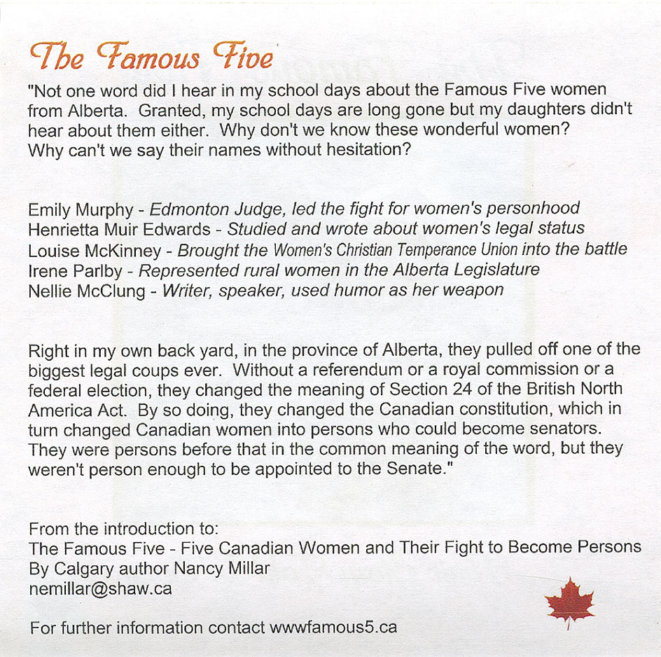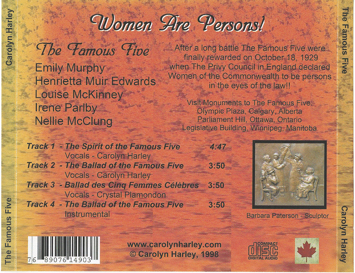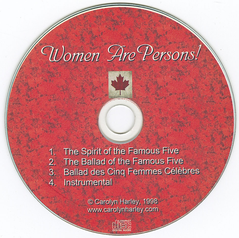You can purchase my beautifully recorded CD with my two songs about The Famous Five. The Ballad of The Famous Five is sung in English and in French. The Spirit of The Famous Five is sung in English. There is also a backing track for each of the songs to be used at events by a soloist or a choir.