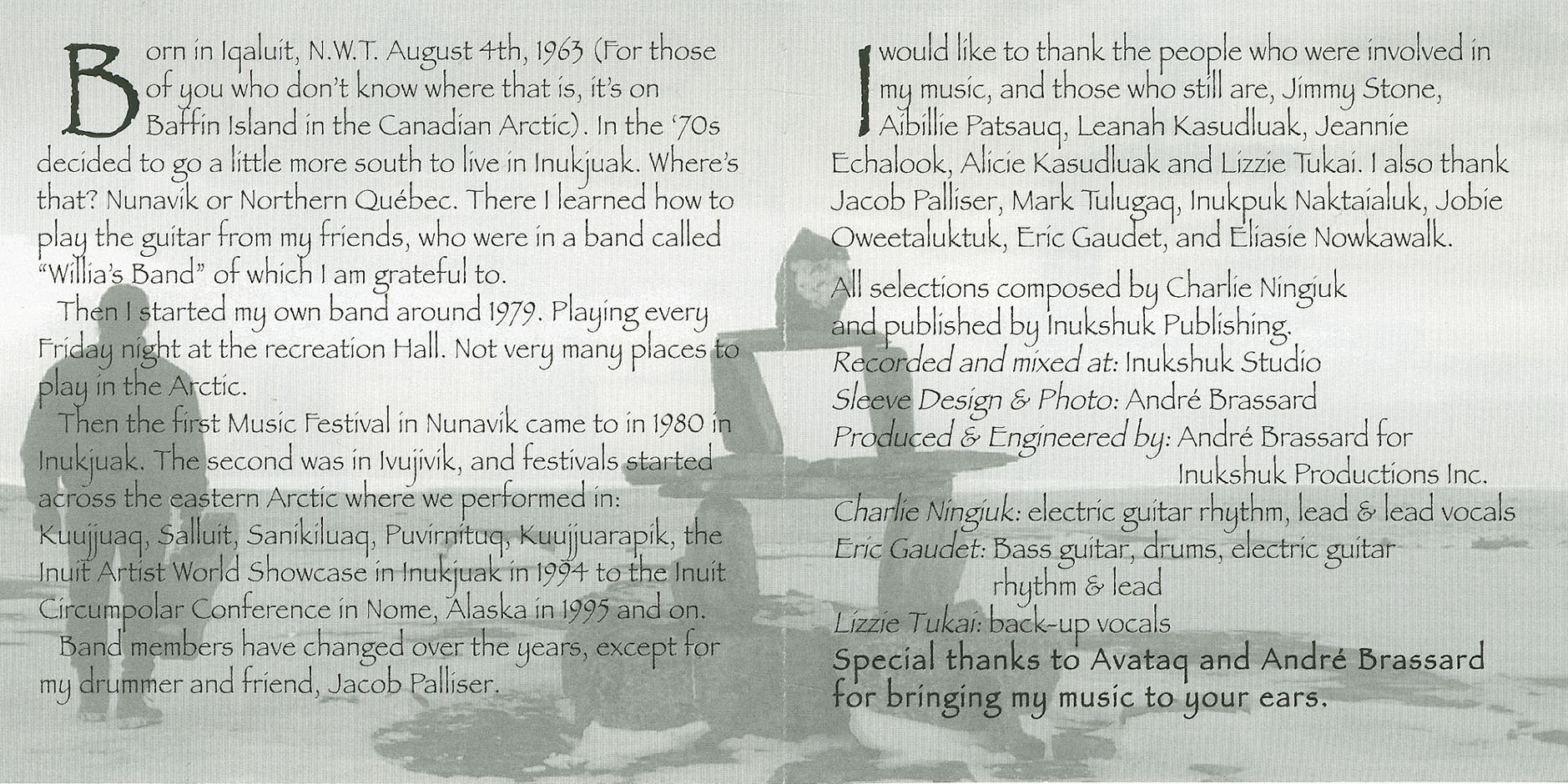 In the spring of 1997, Charlie released his debut album, Inuuqatik, under Inukshuk Productions. Featuring nine tracks, the album showcased his progressive rock style and included standout songs like Nuutsiarit, a distinctive and deeply impressive track that demonstrated Charlie’s ability to fuse modern fuzz-guitar sounds with traditional northern roots. The album was praised for its excellent production quality and easy listening appeal, solidifying Charlie’s reputation as an artist of the Arctic.