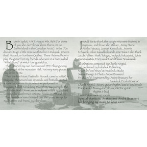 I would like to thank the people who were involved in my music, and those who still are, Jimmy Stone, Aibillie Patsauq, Leanah Kasudluak, Jeannie Echalook, Alice Kasudluak and Lizzie Tukai. I also thank Jacob Palliser, Mark Tulugaq, Inukpuk Naktaialuk, Jobie Oweetaluktuk, Eric Gaudet, and Eliasie Nowkawalk.