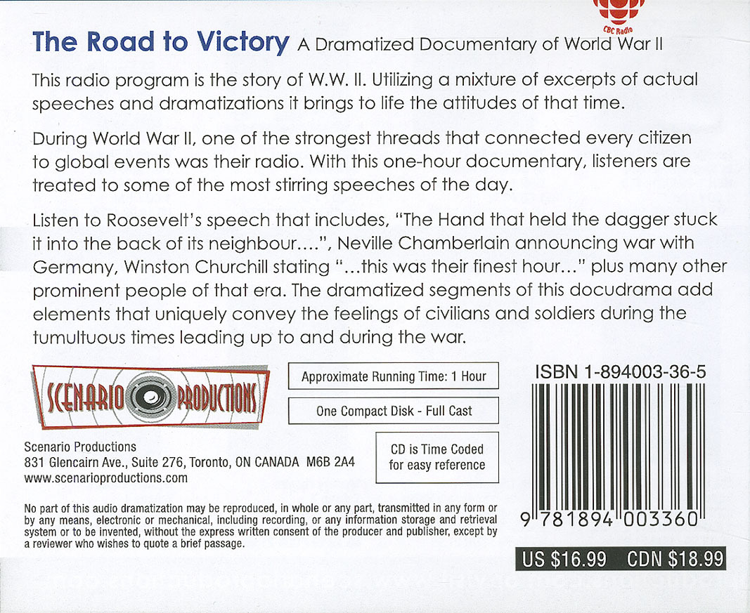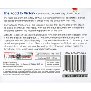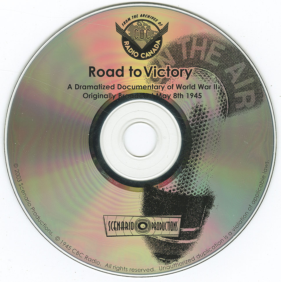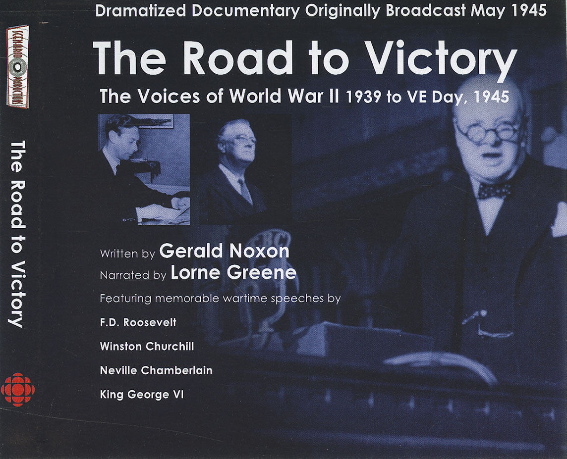 The Road to Victory was originally produced and broadcast by the Canadian Broadcasting Corporation in May 1945. It is described as a "dramatized documentary" and traces the course of the Second World War from its inception to the conclusion of hostilities in Europe (final victory in the Pacific was still pending when the broadcast was originally made). Some special attention is paid to Canadian involvement, though more in the way of indicating what the experience felt like to those directly involved and those left behind on the home front. Replete with the sonorous background music and resonant narration by Lorne Green, the recording provides a very effective sample of the character of radio broadcasts during a period when that medium was of such central importance in conveying rapidly changing day-to-day events. Because the recording was prepared at the conclusion of the major phase of combat, it quite naturally imposes a structure on events: the outcome is known; and what had earlier been inchoate and unpredictable events are now able to be organized into phases and stages in a completed narrative. An attempt is made, though, to convey something of the confusion and uncertainty ordinary people - Canadian and cockney alike - felt during the course of the war, through the use of "dramatized" dialogue. (This dialogue rather interestingly carries some of the inherent gender assumptions of the time, with nervous female voices asking the menfolk what was happening.) Interspersed through the narrative and dramatizations are excerpts from speeches of various of the principal characters in the drama - primarily Winston Churchill and Franklin Roosevelt, but also including H.D.G. Crerar (for Canadian interest), Adolf Hitler, Field Marshall Montgomery, Neville Chamberlain, King George VI, along with war correspondents - that important new media force that emerged during the course of this conflict. Some additional non-English speeches are presented in accented translation. Not surprisingly, the narrative presents the story as an heroic epic; but, in the main, it is an accurate and coherent rendition of events.