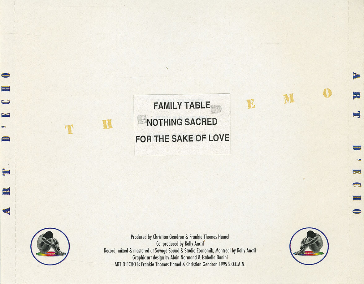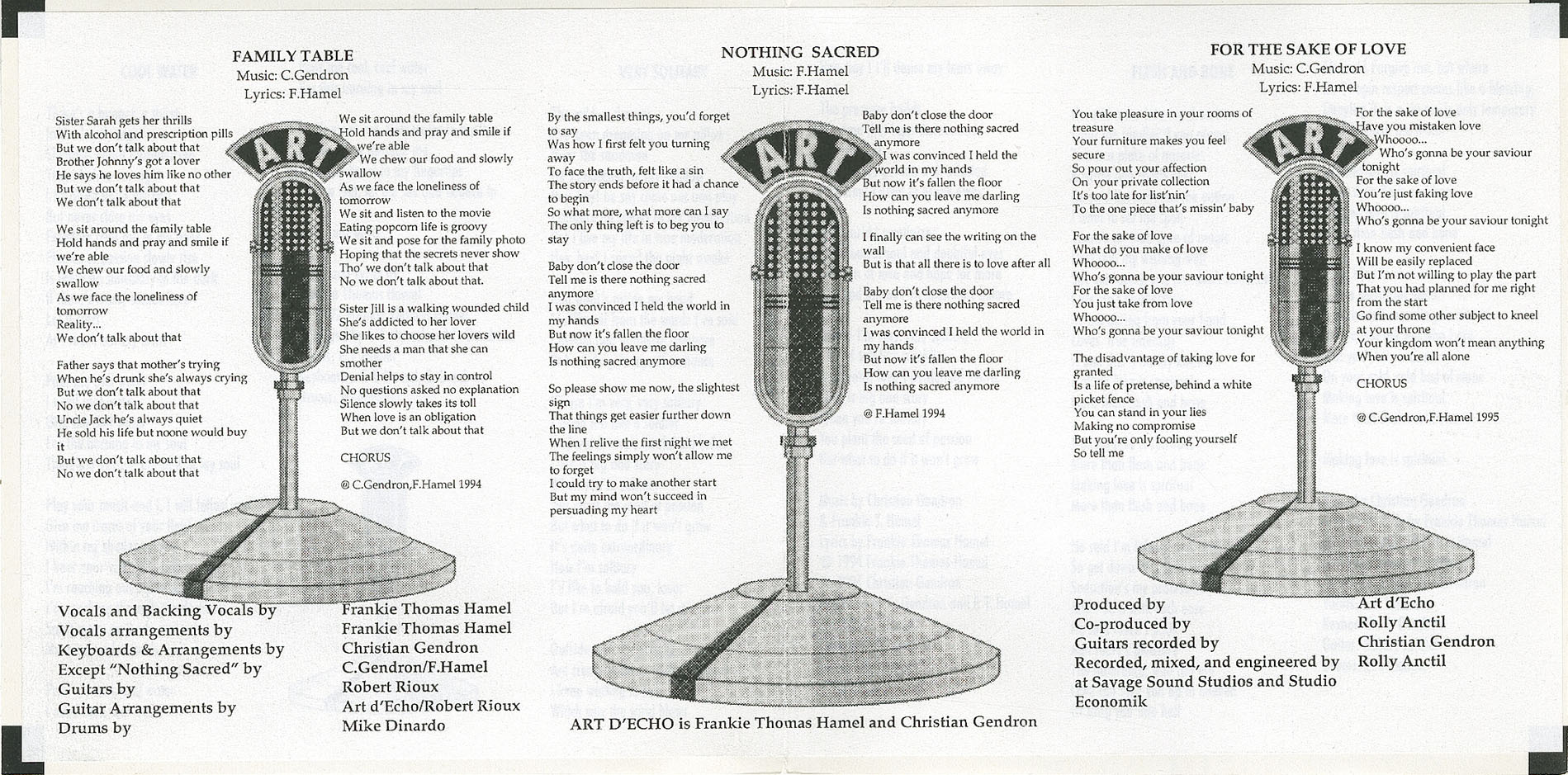 Art d’Echo’s three-song demo, recorded in 1994–1995 at Montreal’s Savage Sound Studios and Studio Economik, stands as a hidden gem of the city’s mid-’90s music scene. Though brief, it reveals a duo with strong songwriting, polished arrangements, and professional-level production. Originally produced as a promotional recording for record labels, it followed an earlier Art d’Echo CD co-produced by Thomas Hamel in 1994 after label interest prompted the duo to record additional material.