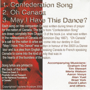 Each song on this companion CD was written during times of prayer for the nation of Canada. The lyrics from "Confederation Song" are drawn completely from Chapter 3 of the book (i.e. what was written in the newspapers of Canada on Dominion Day 1867). "Oh Canada" is a call for the nation to arise and come into our destiny in God.