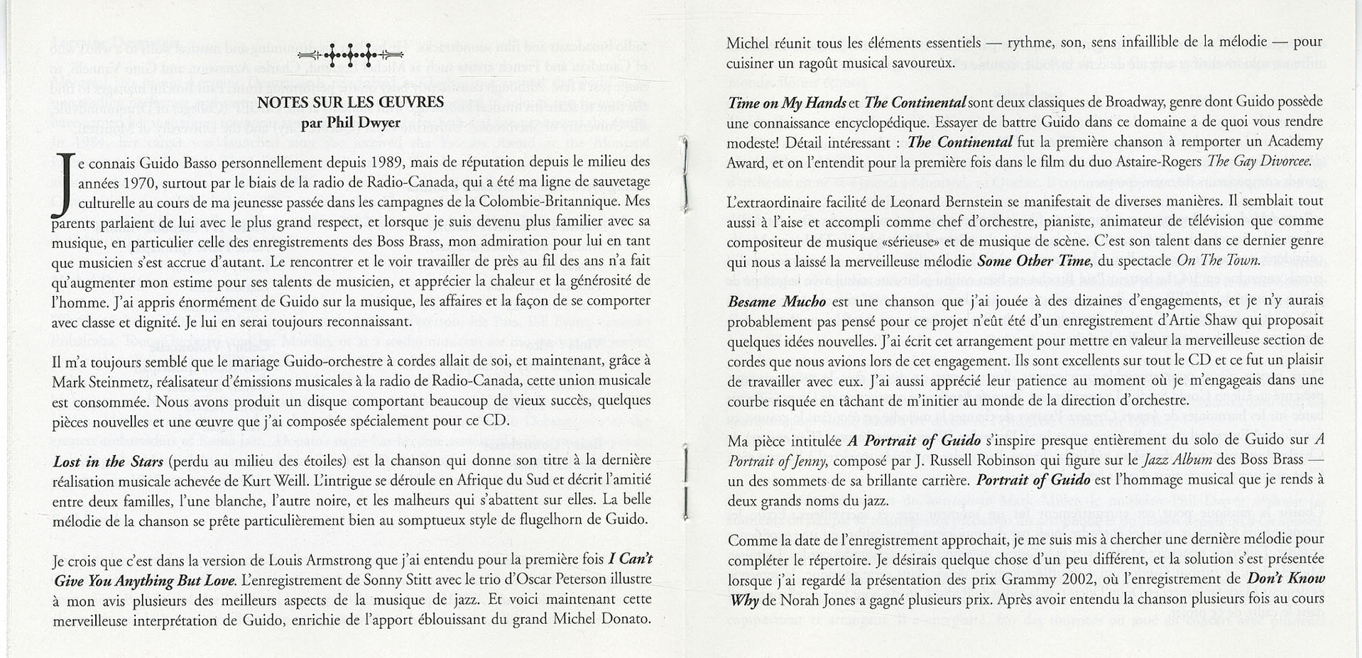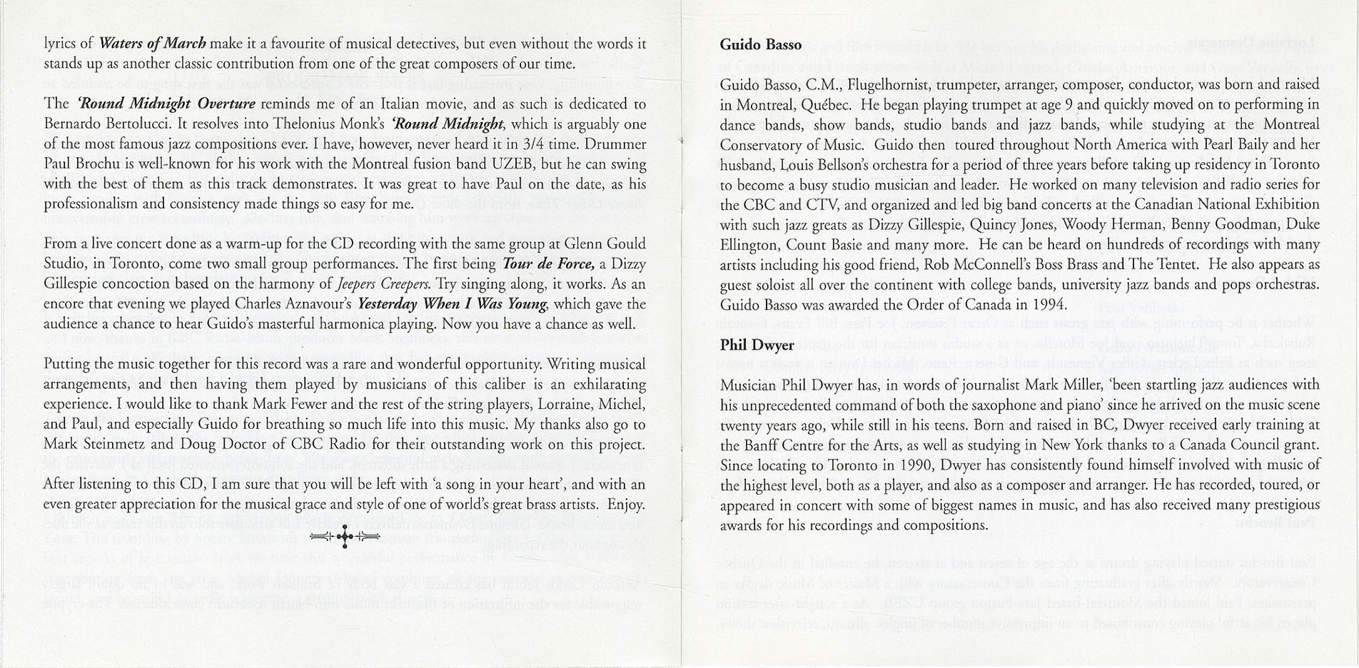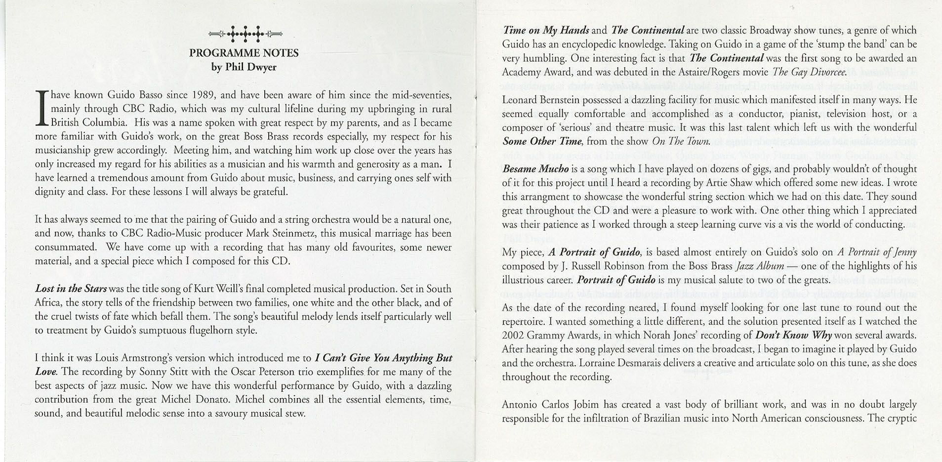It has always seemed to me that the pairing of Guido and a string orchestra would be a natural one, and now, thanks to CBC Radio-Music producer Mark Steinmetz, this musical marriage has been consummated. We have come up with a recording that has many old favourites, some newer material, and a special piece which I composed for this CD.
