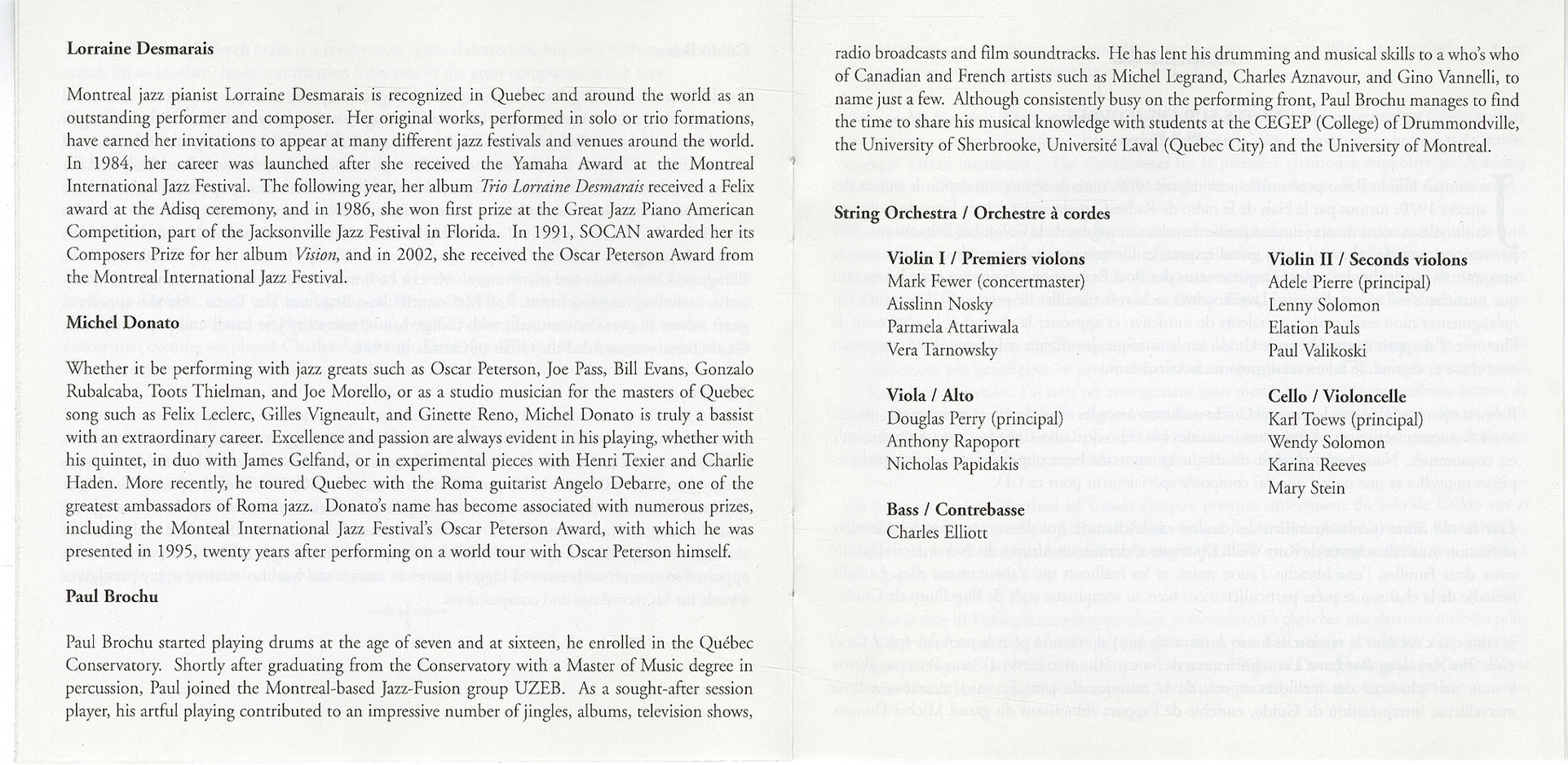 Putting the music together for this record was a rare and wonderful opportunity. Writing musical arrangements, and then having them played by musicians of this caliber is an exhilarating experience. I would like to thank Mark Fewer and the rest of the string players, Lorraine, Michel, and Paul, and especially Guido for breathing so much life into this music. My thanks also go to Mark Steinmetz and Doug Doctor of CBC Radio for their outstanding work on this project.