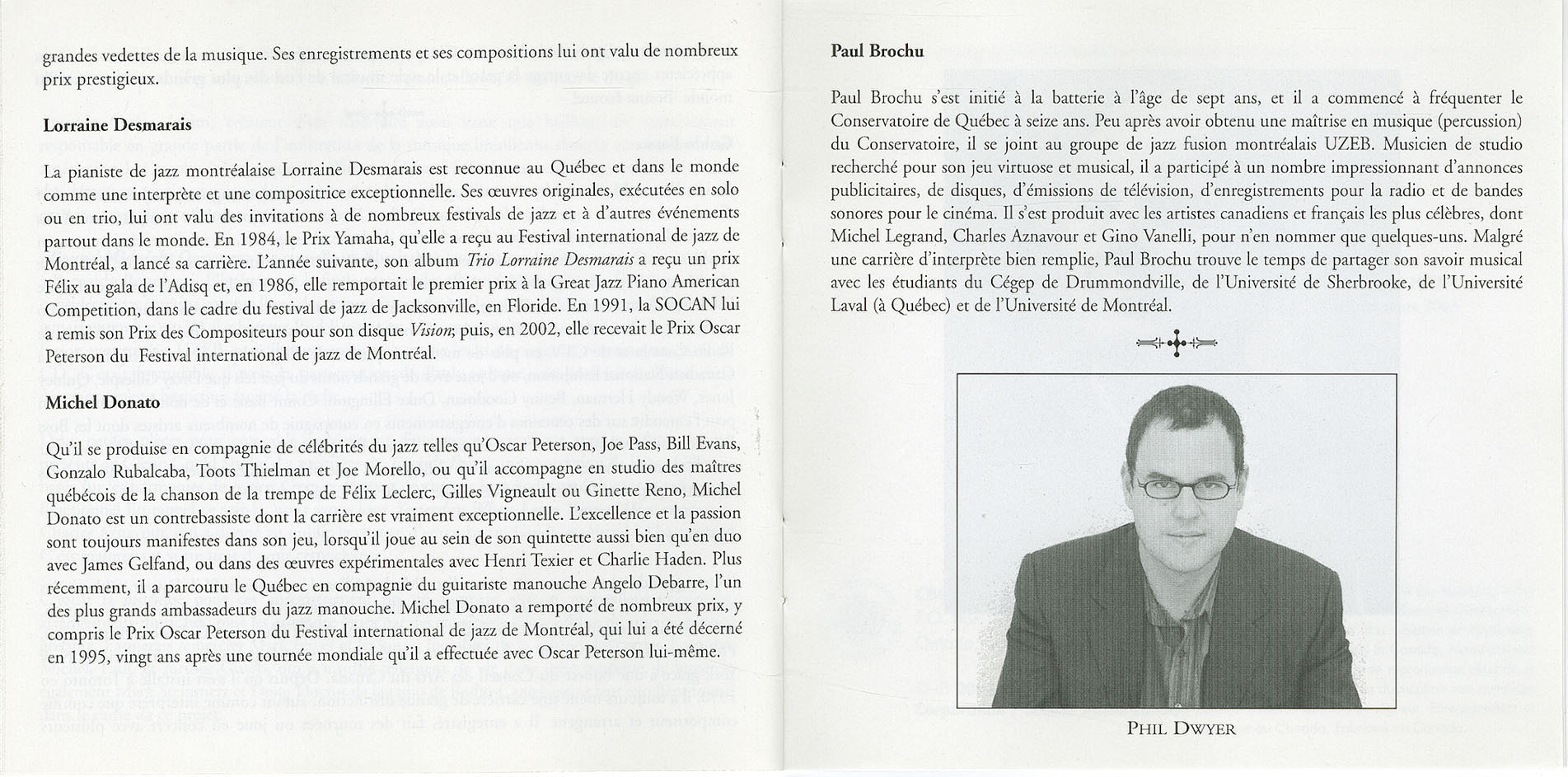 Musician Phil Dwyer has, in the words of journalist Mark Miller, "been startling jazz audiences with his unprecedented command of both the saxophone and piano" since he arrived on the music scene twenty years ago, while still in his teens. Born and raised in British Columbia, Dwyer received early training at the Banff Centre for the Arts, as well as studying in New York thanks to a Canada Council grant. Since locating to Toronto in 1990, Dwyer has consistently found himself involved with music of the highest level, both as a player and also as a composer and arranger. He has recorded, toured, or appeared in concert with some of the biggest names in music and has also received many prestigious awards for his recordings and compositions.