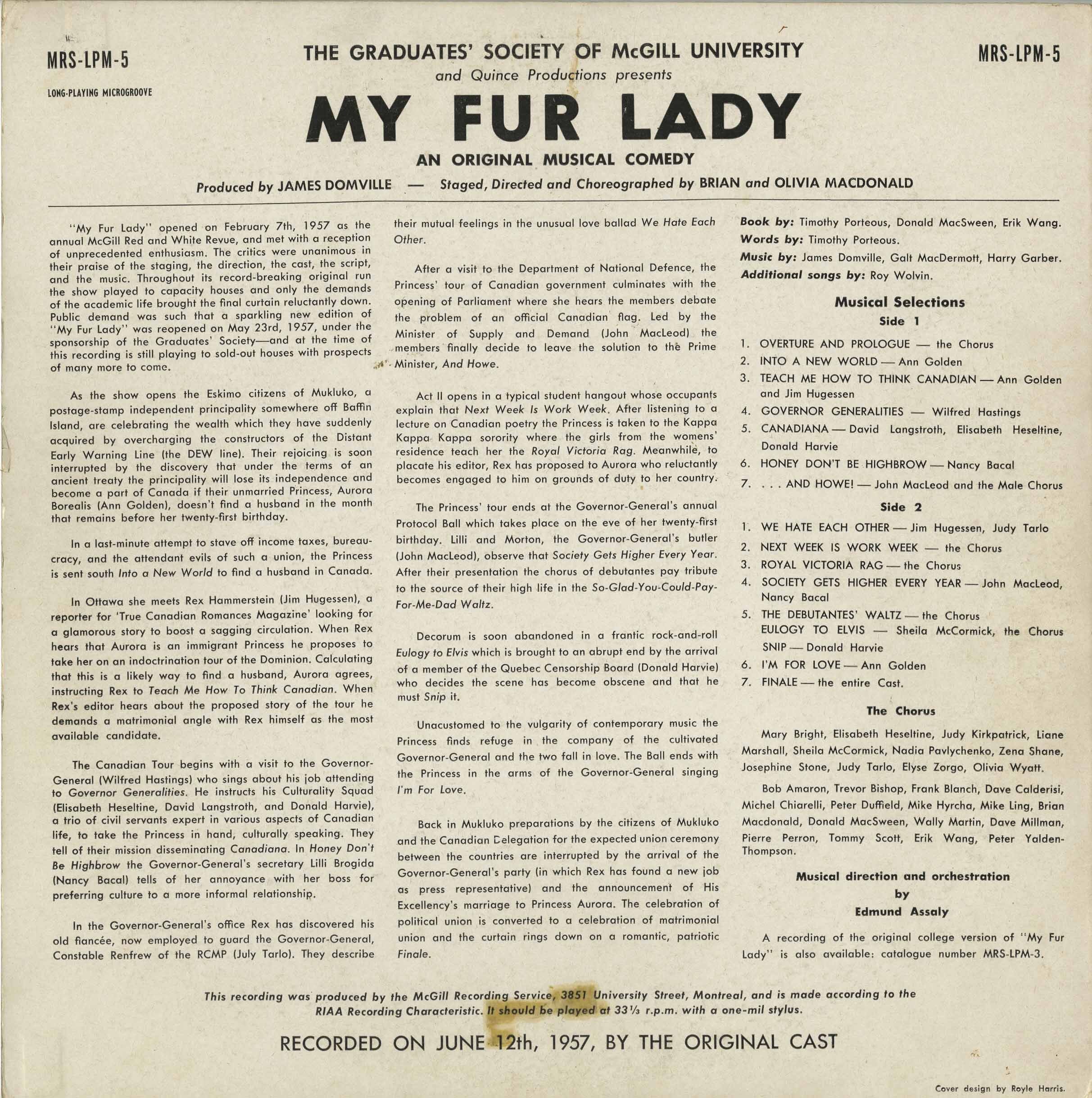 A recording of the original college version of “My Fur Lady” is also available: catalogue number MRS-LPM-3.