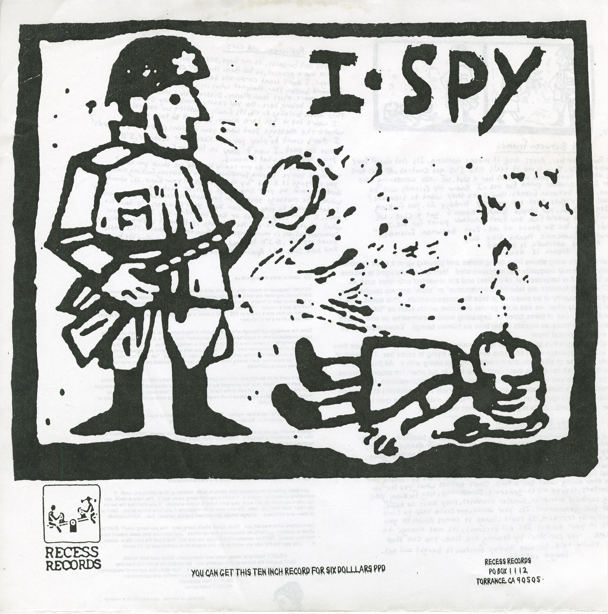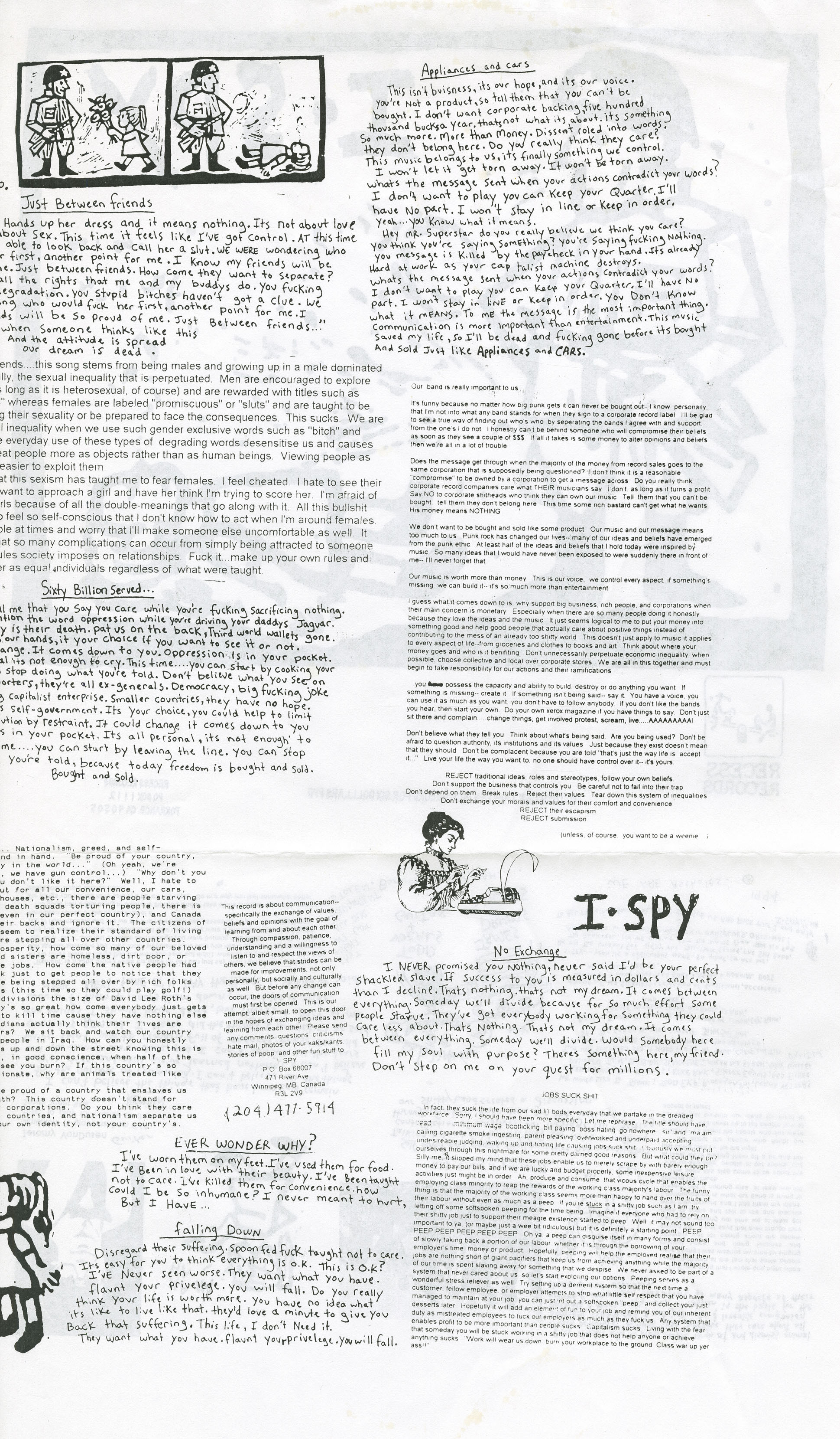 I Spy’s half of the split erupts like a Molotov cocktail — messy, emotional, and unmistakably urgent. Where Propagandhi’s songs are tightly structured and sardonic, I Spy offers pure chaotic energy laced with vulnerability. Tracks like “Remain,” “Just Between Friends,” and “Sixty Billion Served” tackle everything from toxic masculinity and emotional repression to class war and fast food imperialism. The lyrics — often scrawled like zine poetry in the album insert — hit hard with no filter, but also show a level of introspection rare in hardcore punk.