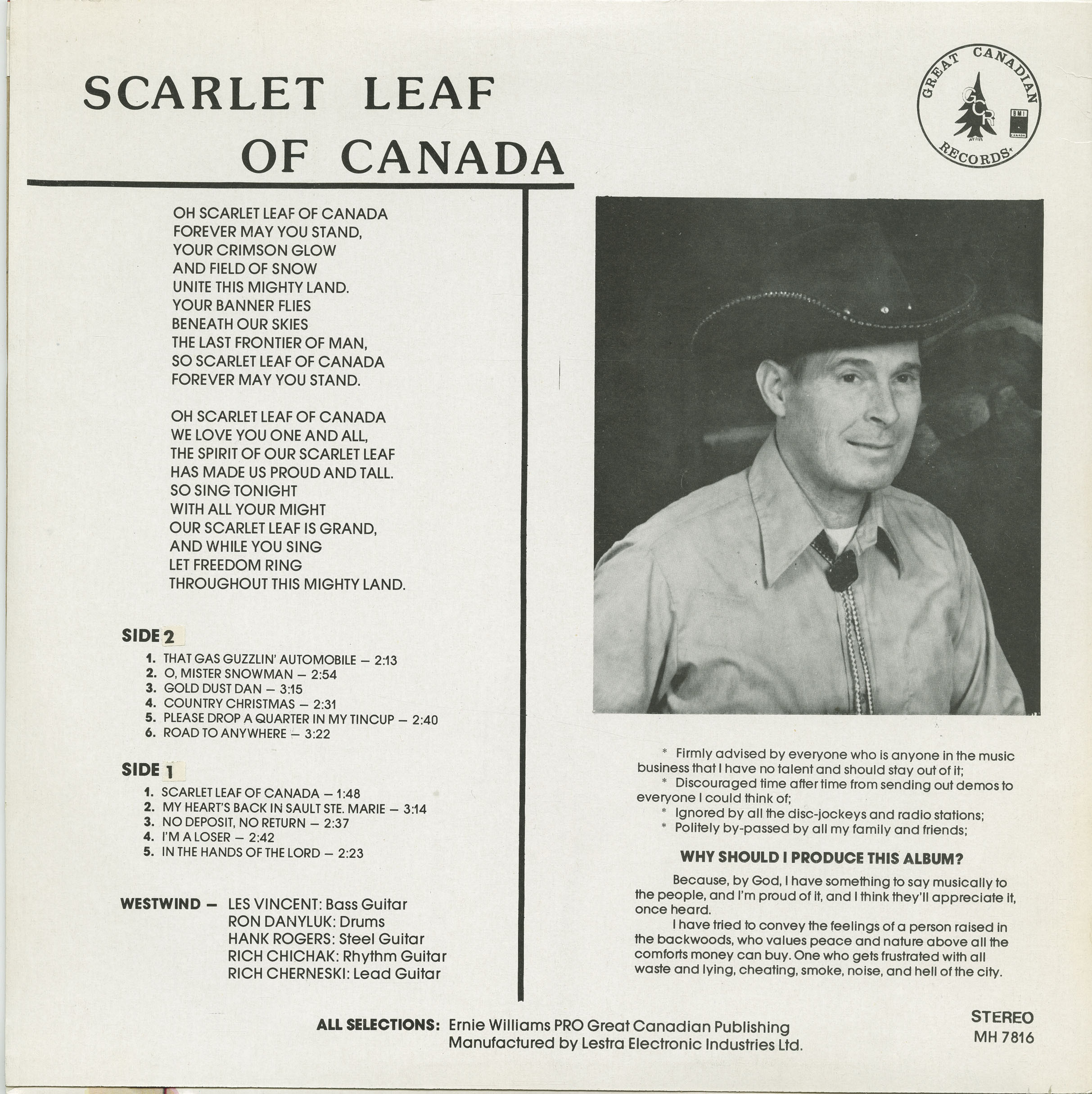 He assembled Westwind, a band that consisted of Les Vincent on bass, drummer Ron Danyluk, and the guitar trio of Hank Rogers on steel, Rich Chichak on rhythm, and Rich Cherneski on lead, and recorded some raw demos that were shopped around to labels around western Canada. But the labels’ big fish weren’t biting, so the band travelled to the big city (Edmonton) and recorded some tracks at Lestra Electronic Industries. The result was his only album, SCARLET LEAF OF CANADA, issued by his own label, Great Canadian Records, in the early ’80s.