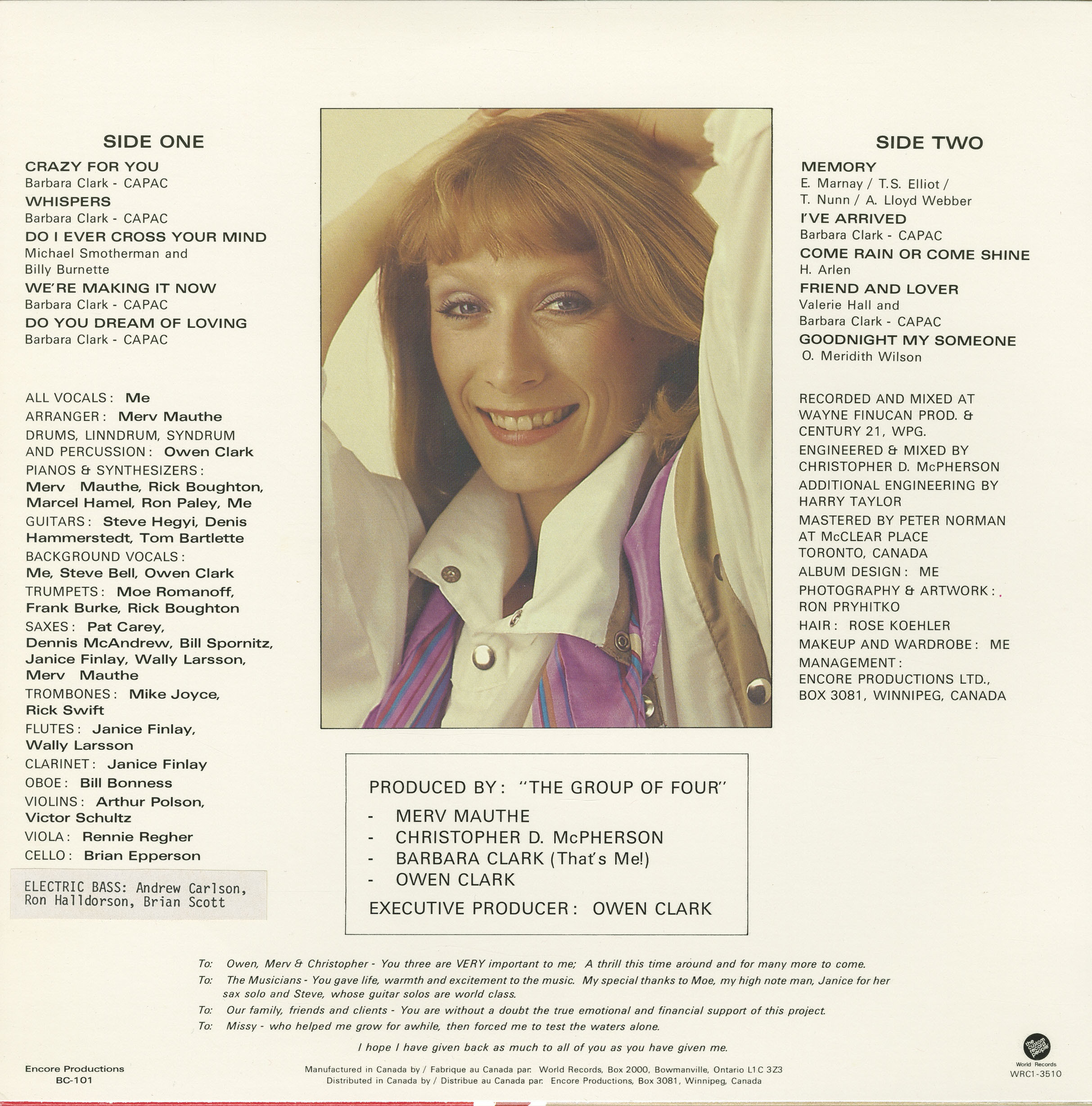 Barbara Clark: all vocals, background vocals, pianos, synthesizers