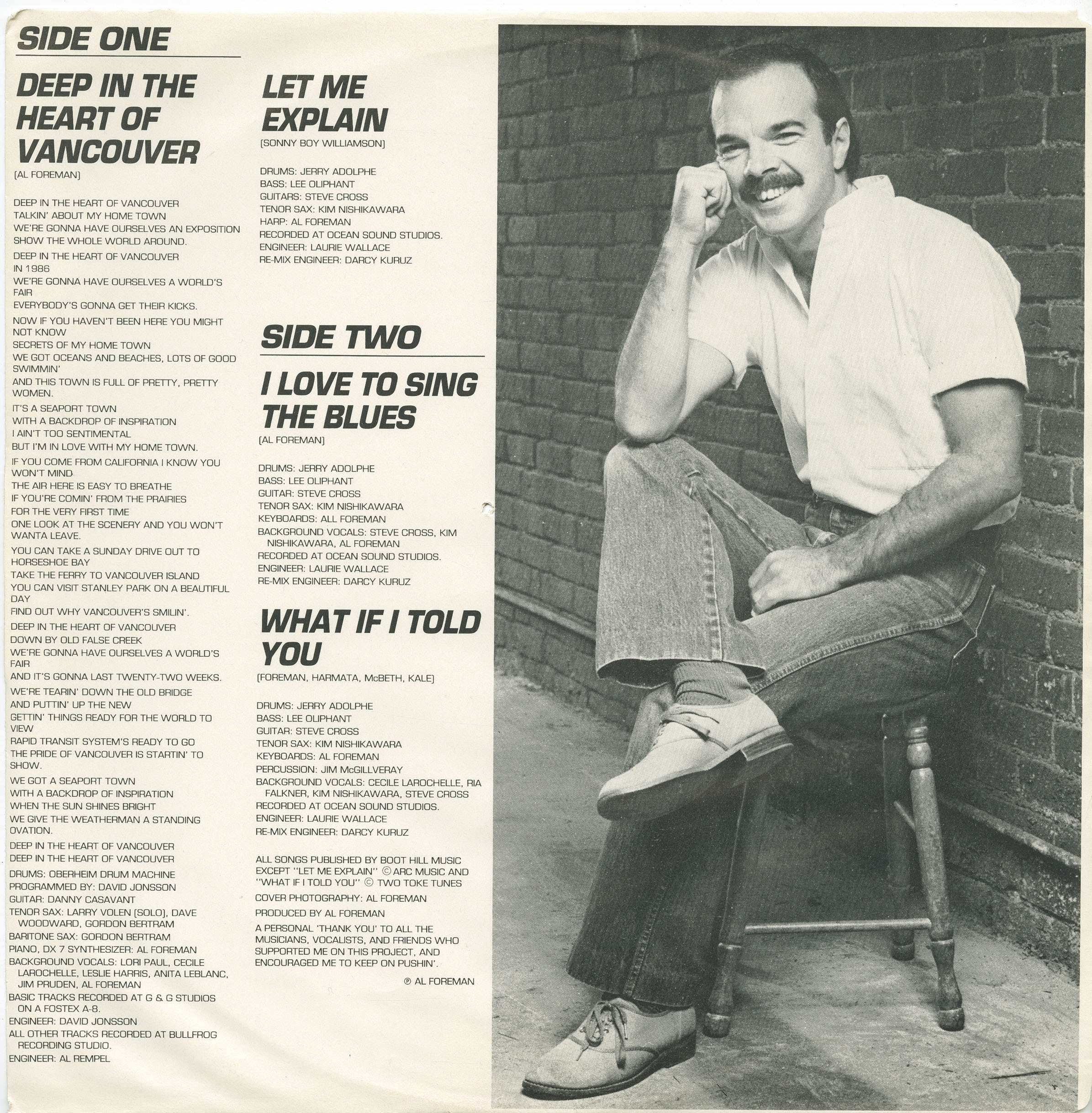 In the 1980s, Foreman deepened his musical knowledge by enrolling at Capilano College’s commercial music program, studying voice, theory, and arranging. This led to the 1983 release of his own single, “Everybody Wants More Money,” on his Munchkin Records label. In 1986, he issued Deep in the Heart of Vancouver, a spirited tribute to his home city written for Expo ’86.