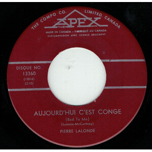 Lalonde, Pierre - Aujourd'hui C'est Congé (Bad To Me) b/w Un Je Ne Sais Quoi