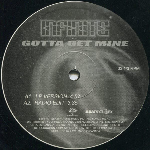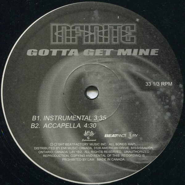 The Beatfactory/EMI RapEssentials: Volume 2 wisely chose "Gotta Get Mine" as the first single off the compilation, catapulting Infinite into the North American spotlight. "Gotta Get Mine" rang in at an incredible number 17 on Energy 108 top 108 of 1997. Infinite has been selected as the spokesperson for "Chill Out", a clothing drive for the homeless, in which the Toronto Blue Jays and Toronto Raptors are sponsors. He has also made a host appearance on MuchMusic's Rap City as well as performing along side Bob Marley's band, The Wailers on MuchMusic's Da Mix, Black History Month discussion panel.